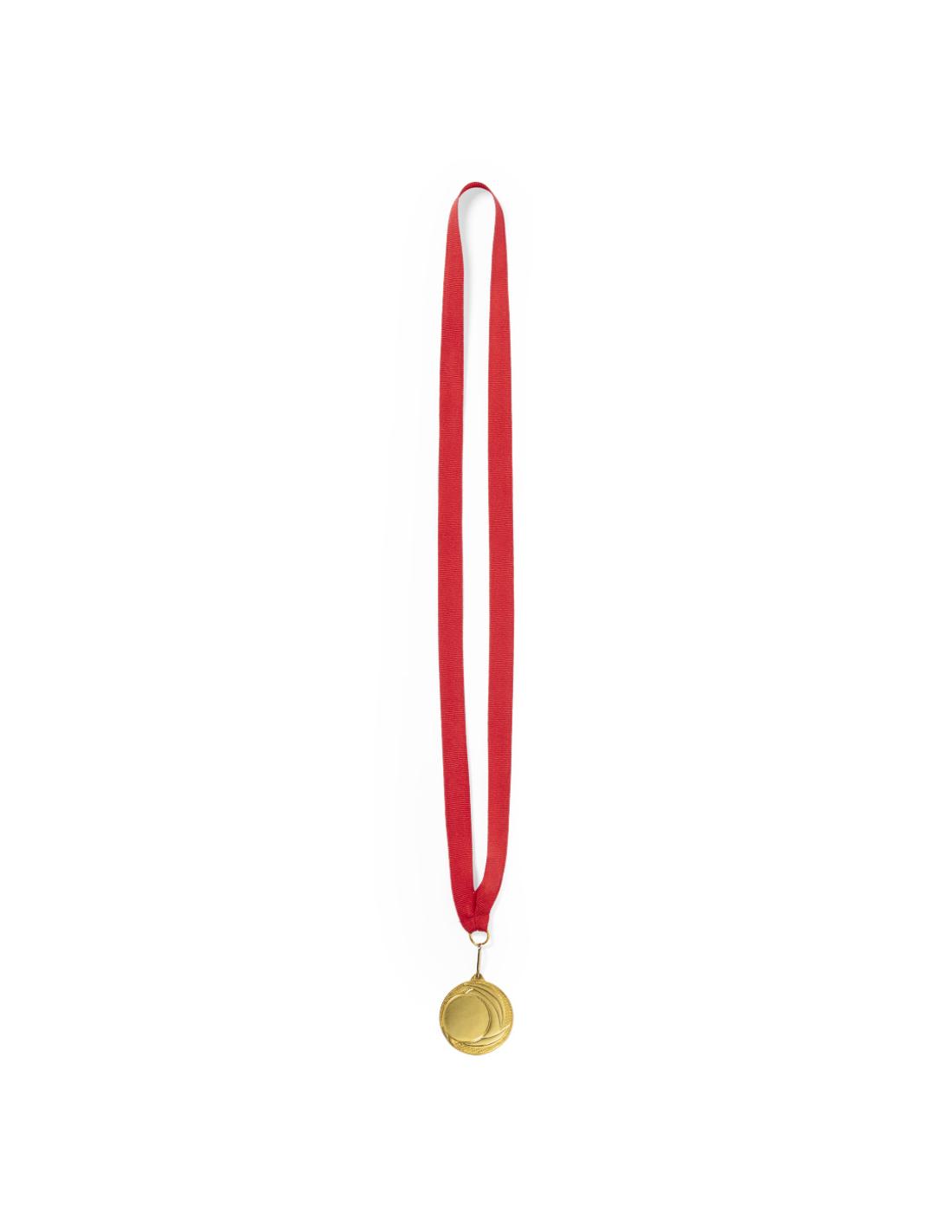 Medalla metálica de acabado dorado en relieve. Con cinta de poliéster en rojo, mosquetón metálico a juego y especialmente diseñada para marcaje en láser.