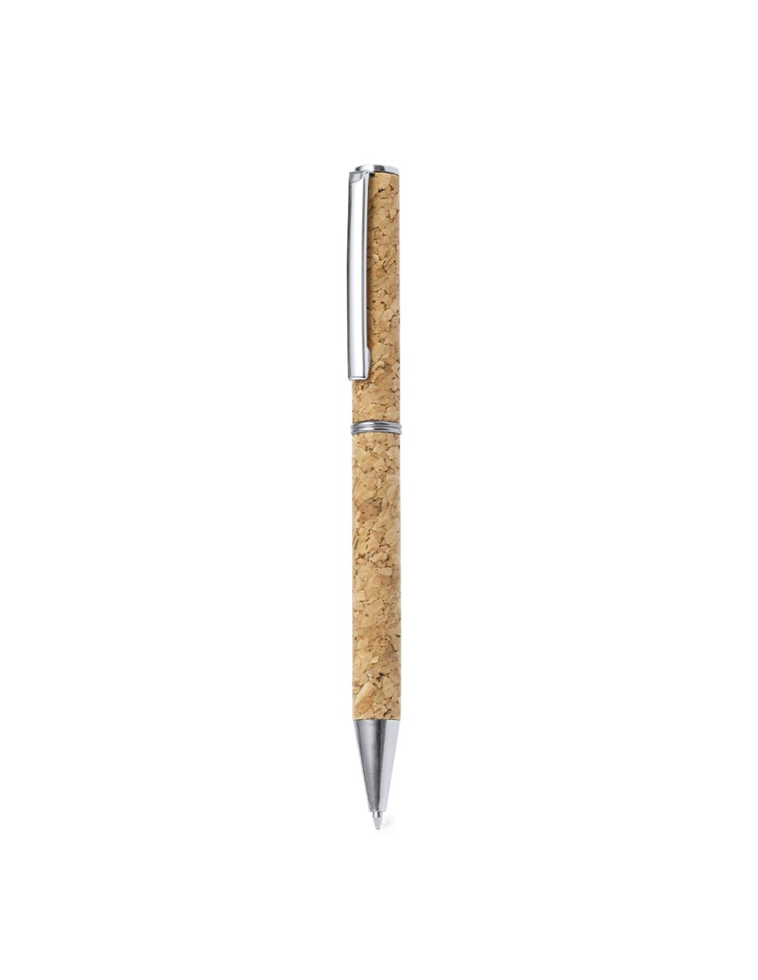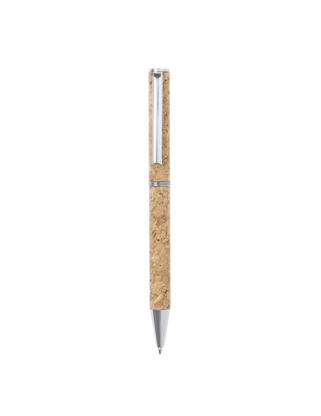 Bolígrafo con cuerpo en corcho natural. Clip metálico y accesorios cromados. De mecanismo giratorio y de tinta azul.Elaborado con elementos vegetales para así fomentar la utilización de materias primas naturales y reducir las emisiones contaminantes.