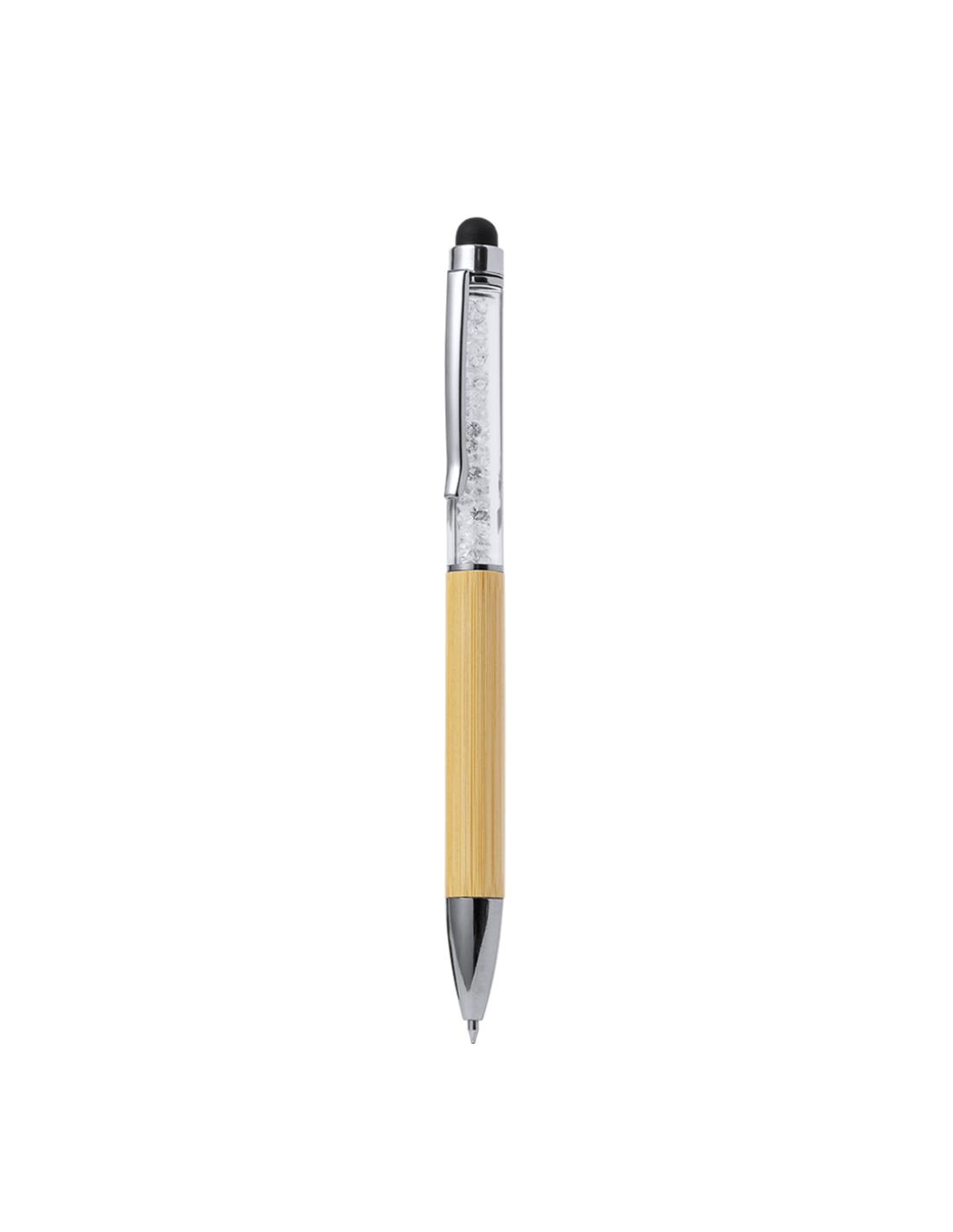 Elegante bolígrafo puntero de bambú. Estructura elaborada en bambú con una cápsula transparente que alberga cristales con forma de diamantes. Este elegante bolígrafo cuenta también con un puntero en la parte superior, clip y elementos decorativos metálicos. Con mecanismo giratorio y en tinta azul. Materiales como el bambú fomentan la utilización de materias primas naturales, reduciendo las emisiones contaminantes. Proviene de una planta de gran resistencia y versatilidad, con crecimiento y regeneración rápidos, siendo una excelente alternativa al uso de madera tradicional.