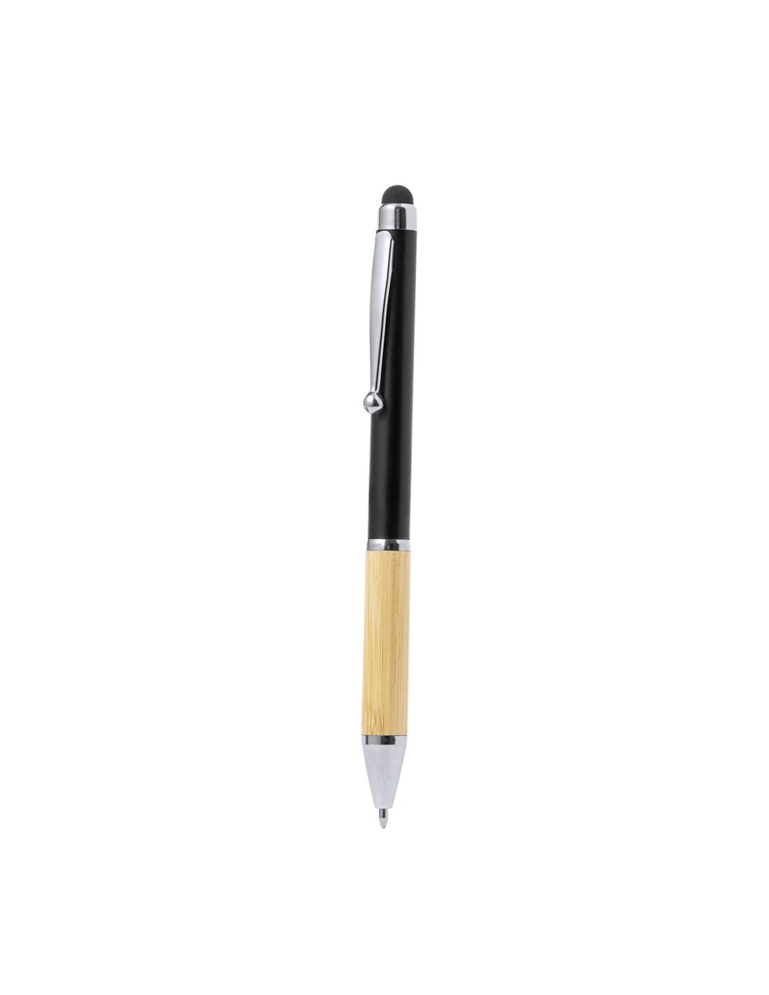Elegante bolígrafo puntero de bambú y ABS. Cuerpo en acabado brillante y empuñadura en bambú con puntero en la parte superior en negro, con la caña en una amplia gama de distintivos colores metálicos. Clip metálico, con mecanismo giratorio y en tinta azul. Presentado en bolsa individual reciclada.Materiales como el bambú fomentan la utilización de materias primas naturales, reduciendo las emisiones contaminantes. Proviene de una planta de gran resistencia y versatilidad, con crecimiento y regeneración rápidos, siendo una excelente alternativa al uso de madera tradicional.