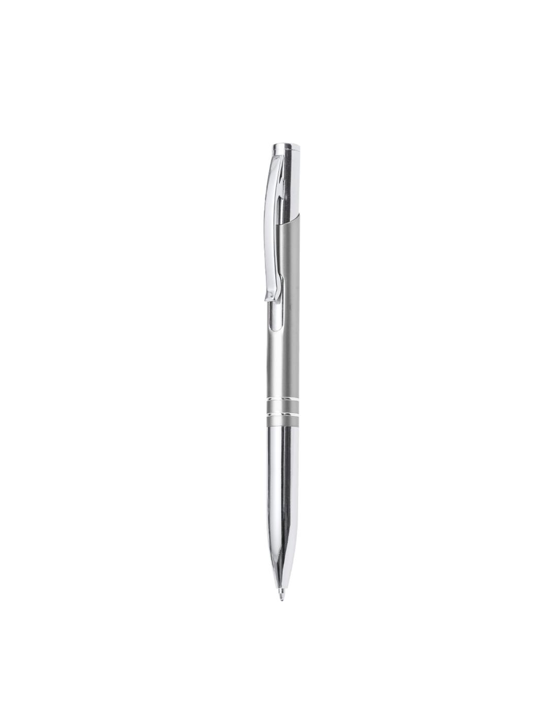 Original bolígrafo de mecanismo pulsador en elegante diseño bicolor. Cuerpo troquelado en aluminio de suave acabado en variados colores. Original clip, anillas y punta en plateado. En tinta azul.