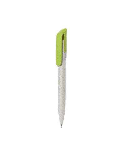 Práctico bolígrafo fabricado en caña de trigo. De mecanismo pulsador, en tinta azul y con logotipo Wheat Straw en la parte superior del bolígrafo. Con clip en variada gama de colores y cuerpo natural. La caña de trigo fomenta la utilización de materias primas naturales, reduciendo así las emisiones contaminantes.