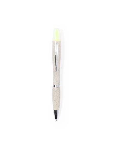 Práctico bolígrafo fabricado en caña de trigo y ABS con marcador incluido. De mecanismo giratorio y en tinta azul. En la parte superior incluye un útil marcador amarillo fluorescente con capucha. Logotipo Wheat Straw en la parte superior del bolígrafo, con clip y accesorios metálicos, y cuerpo color natural. La caña de trigo fomenta la utilización de materias primas naturales, reduciendo así las emisiones contaminantes.