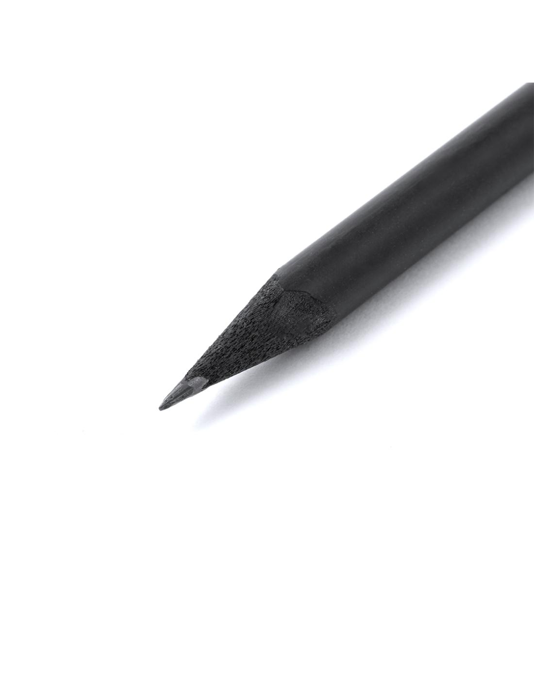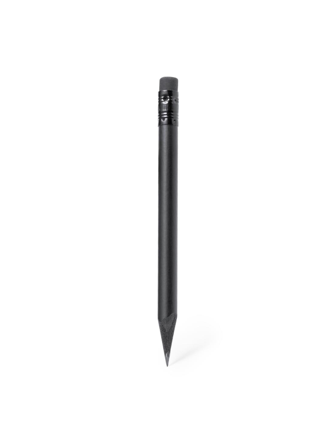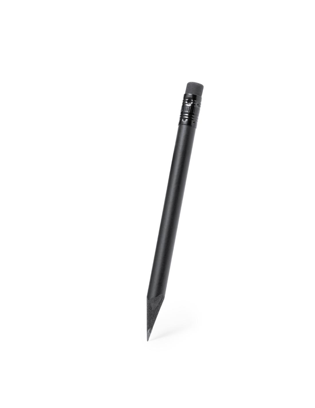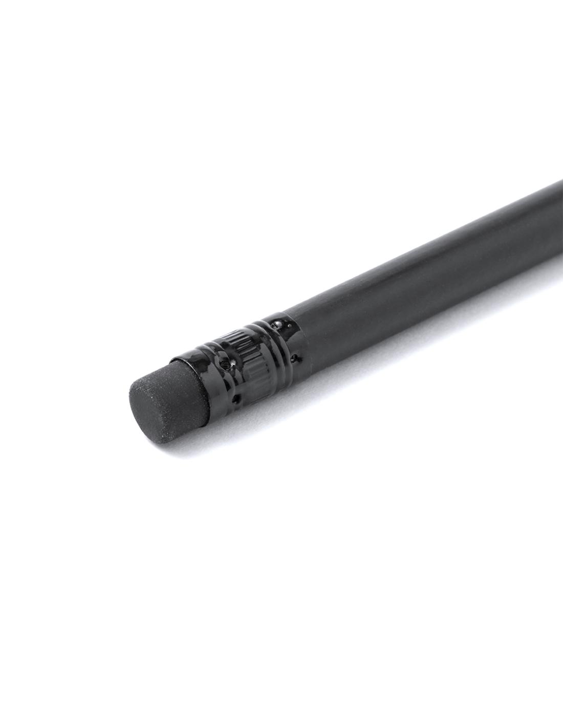 Lápiz de madera natural en acabado negro mate, con mina negra, punta afilada y goma en la parte superior a juego.