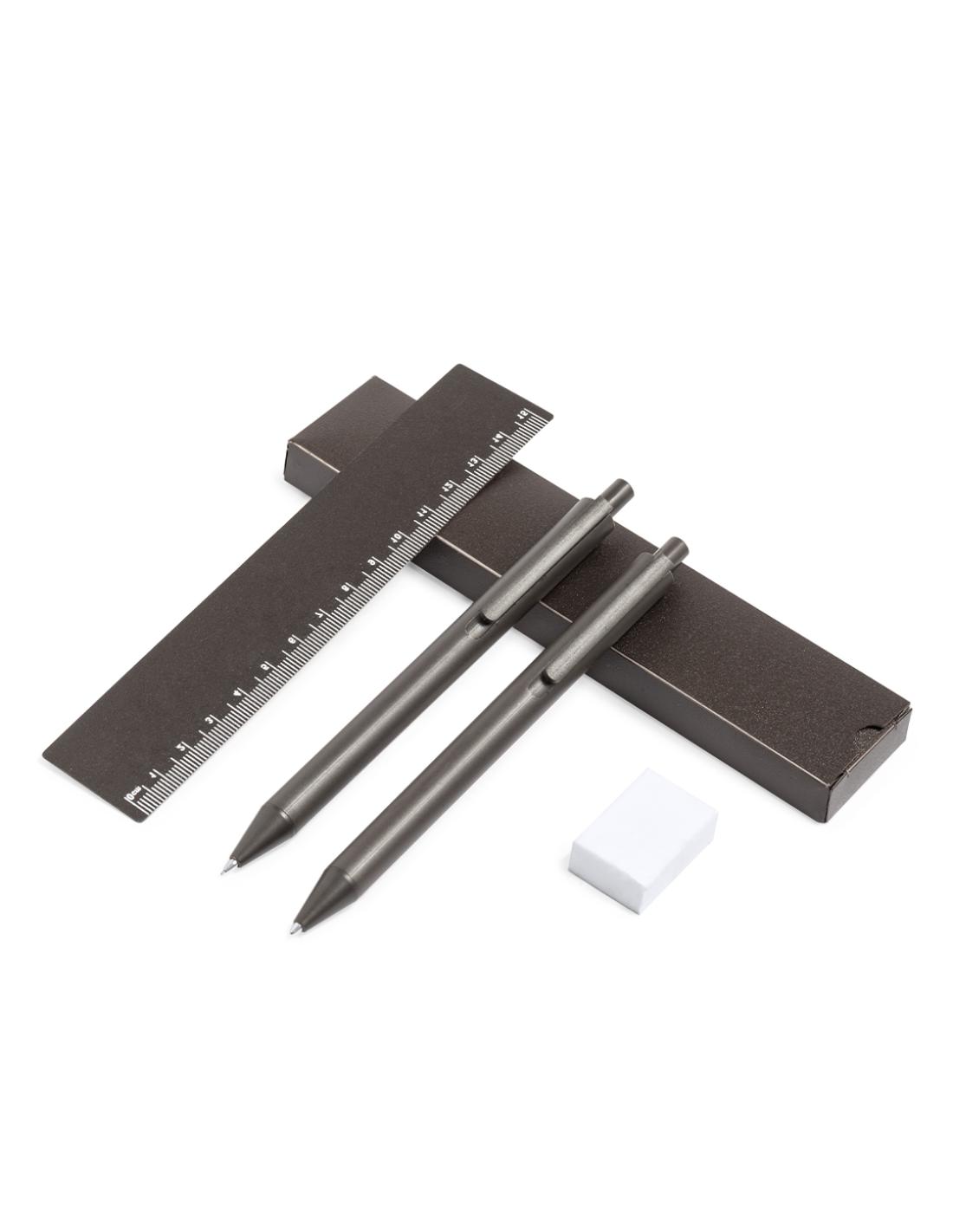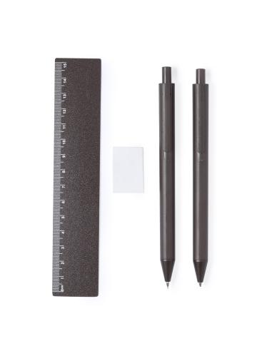 Set de bolígrafo, portaminas y regla, fabricados en fibra de café. Bolígrafo en tinta azul y portaminas con 2 minas incluidas de 0,7mm, ambos con clip. Incluye una práctica regla de 15 cm y útil goma. Presentado en estuche individual de fibra de café. Logotipo fibra de café en la parte superior del bolígrafo y portaminas.La fibra de café es una solución circular que se obtiene de la utilización de los residuos producidos en la obtención del café. Una alternativa sostenible que favorece la reducción del uso de plásticos, ahorrando energía en su proceso de fabricación y contribuyendo al cuidado del medio ambiente.