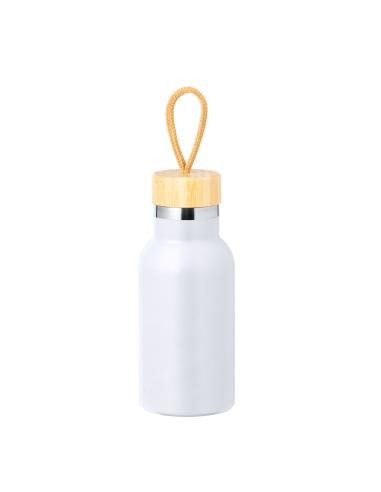 Bidón térmico de 350 ml de capacidad, fabricado en acero inox de doble pared. Incluye original tapón a rosca en bambú y asa para transporte en color natural. Disponible en variada gama de colores y presentado en caja individual de diseño kraft.