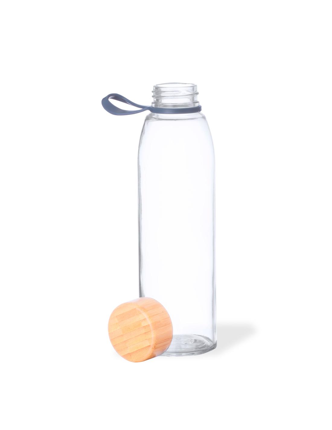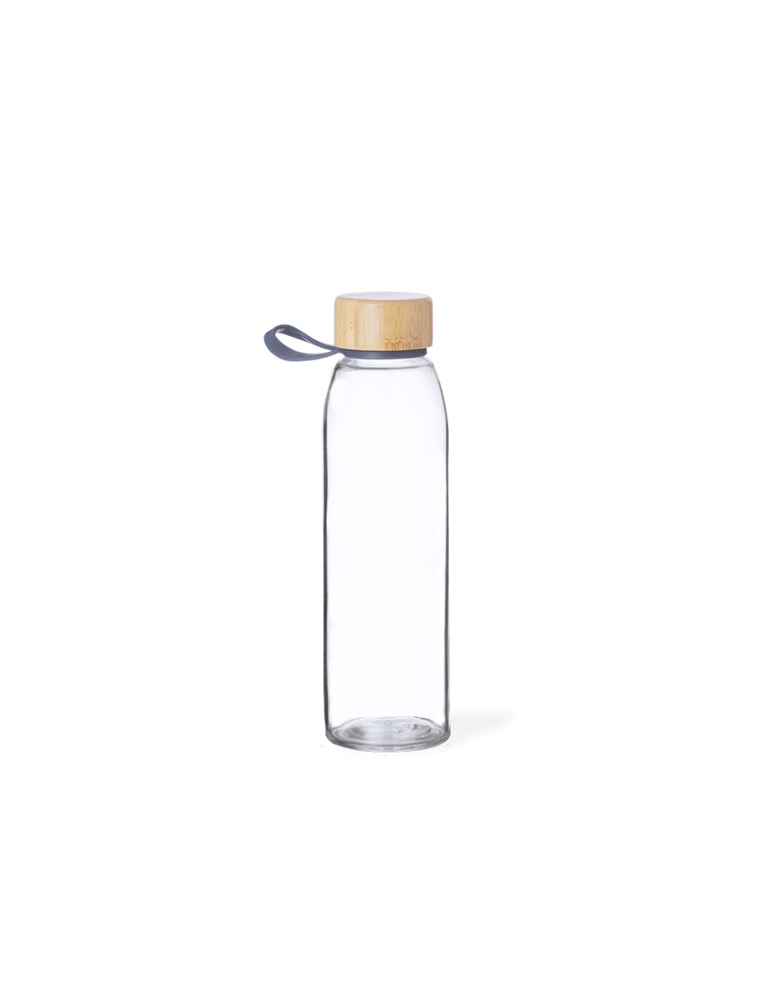 Bidón de cristal de 500 ml. Tapón de rosca en bambú con práctica asa de silicona. Presentado en caja de diseño kraft.