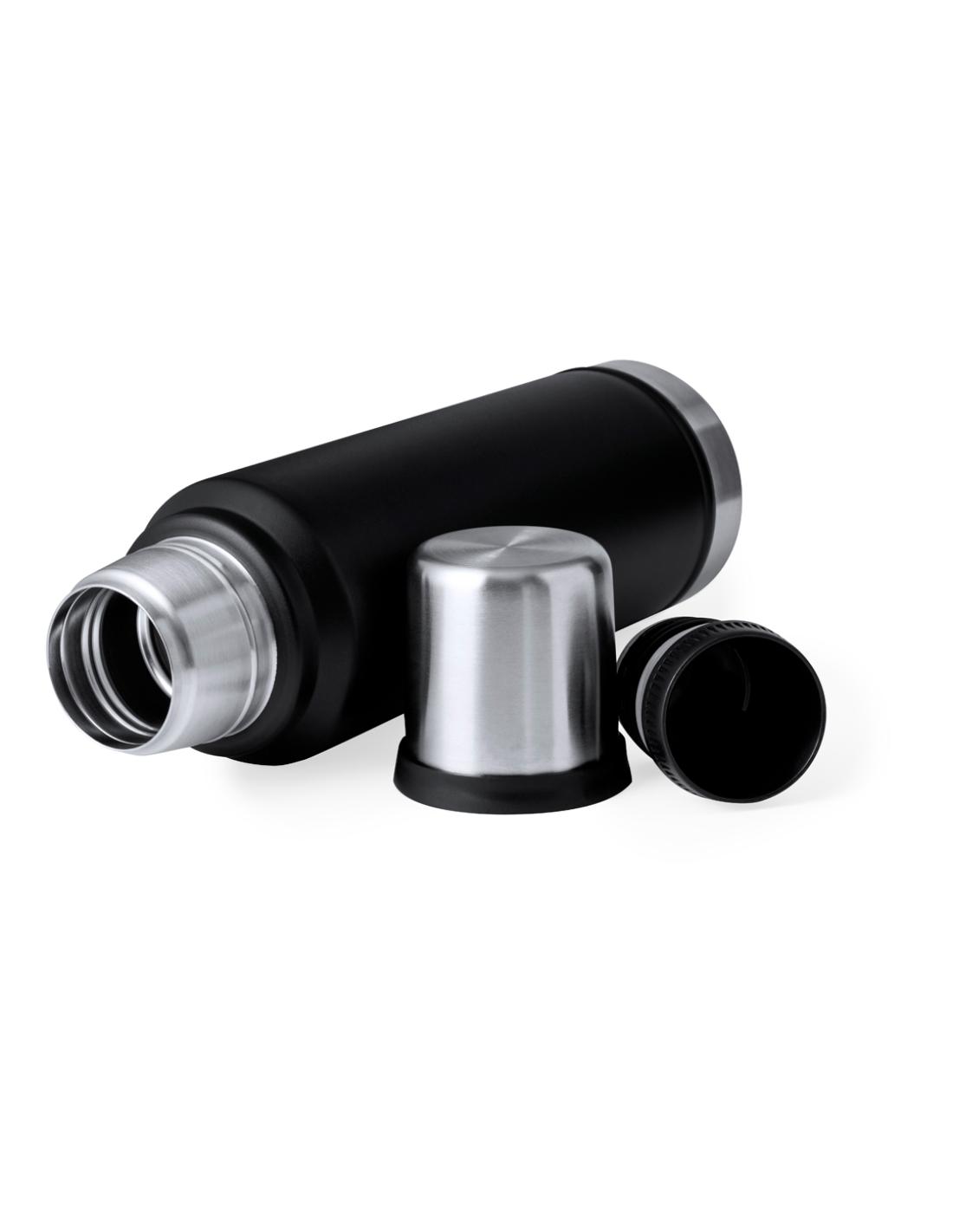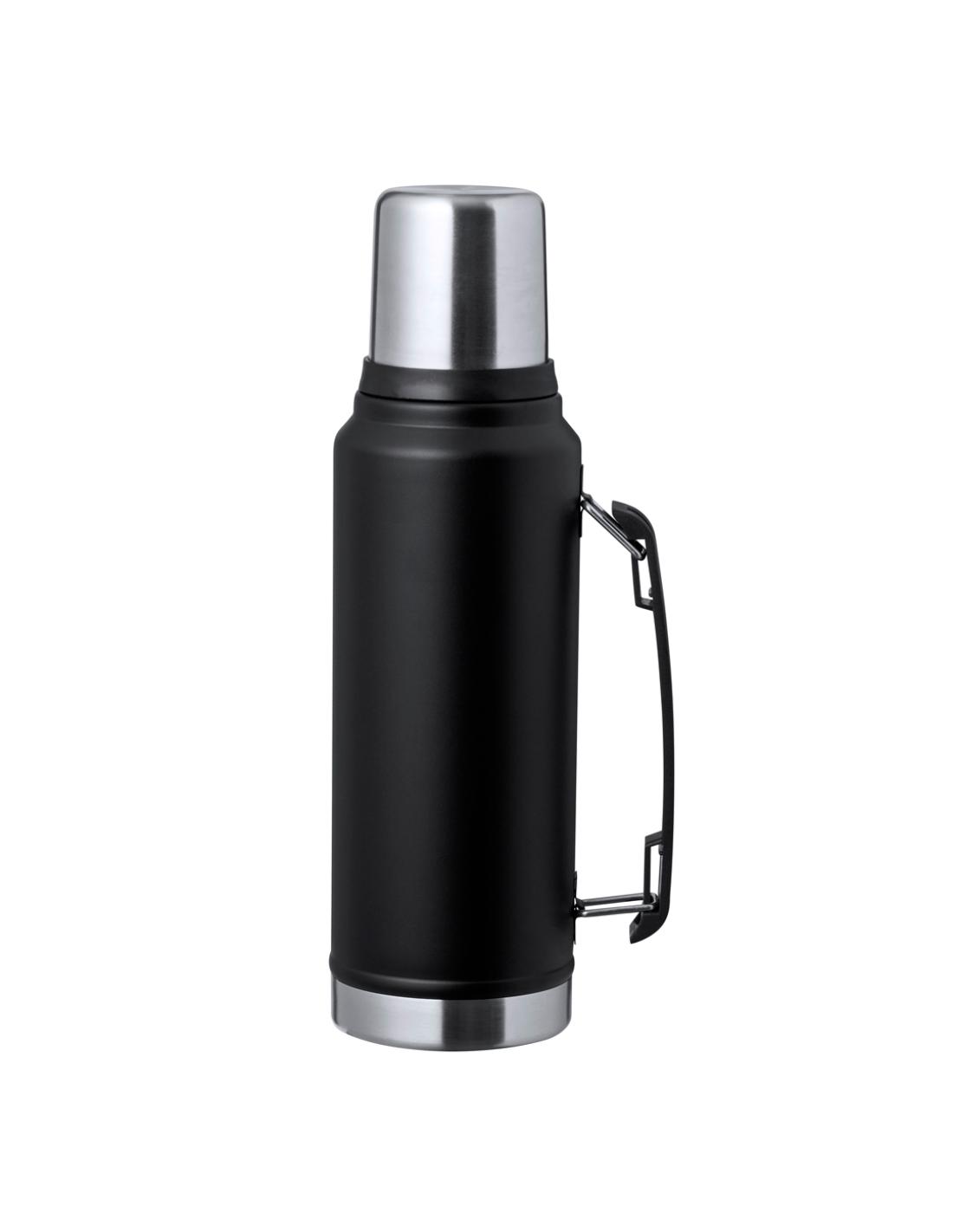 Termo de acero inox de 1L de capacidad. Combinación de color negro con acero pulido de elegante acabado, de cierre de rosca con tapón en forma de vaso de 200 ml y asa en el lateral para un fácil transporte. Presentado en caja de diseño kraft.