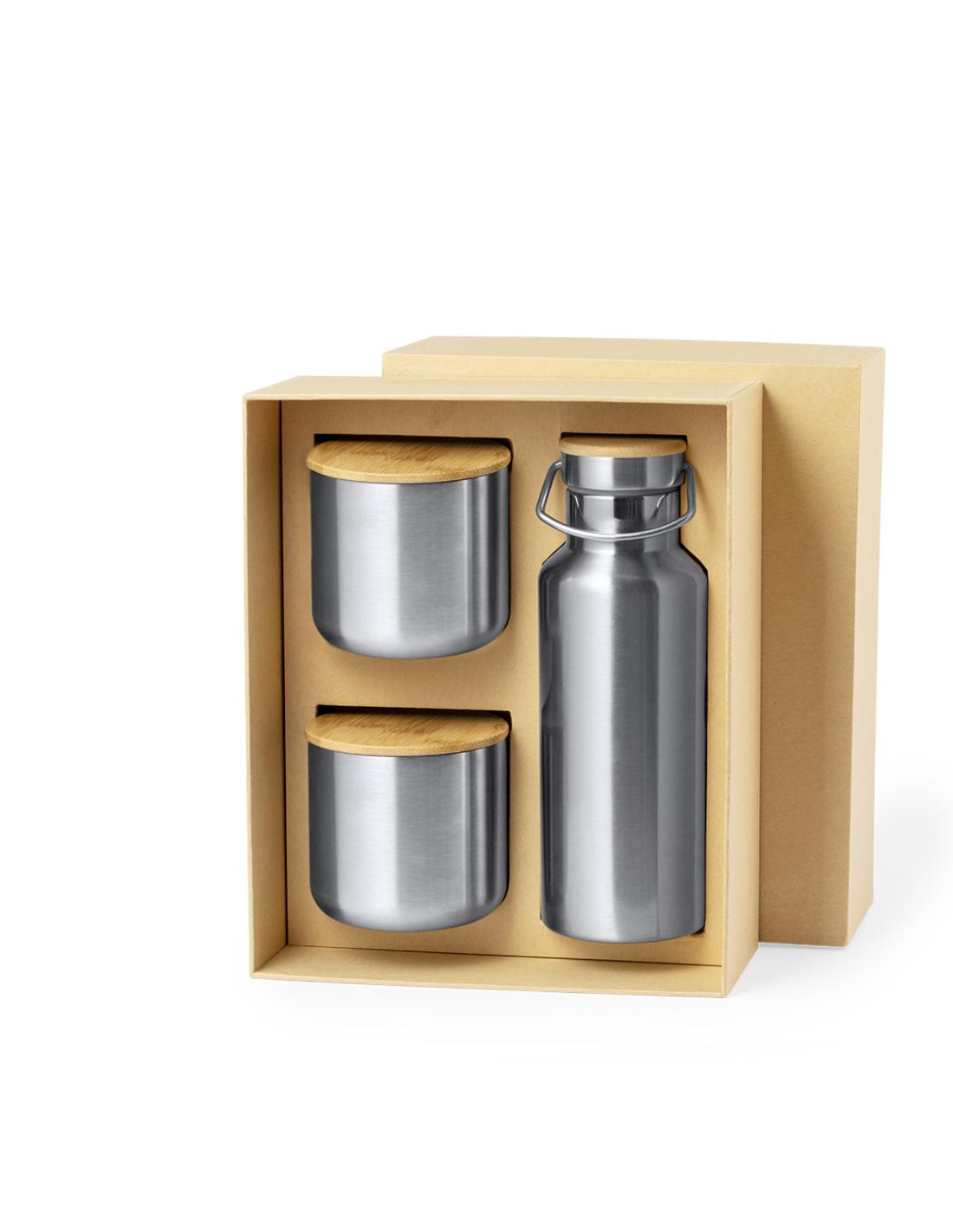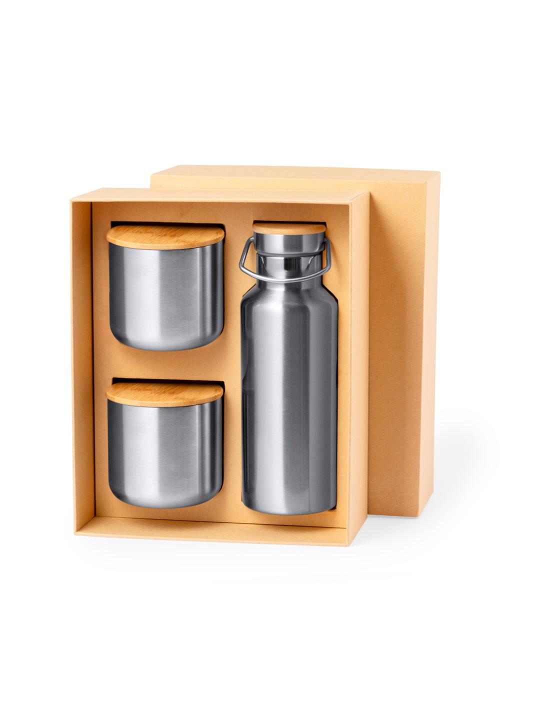 Práctico set de bidón y vasos térmicos en acero inox. Incluye bidón térmico de 500 ml de capacidad fabricado en acero inox con detalle superior de bambú y asa. Además, contiene 2 vasos de 300 ml de capacidad cada uno fabricados acero inox y tapaderas fabricadas bambú con cierre de presión. Presentado en una caja troquelada de diseño kraft.