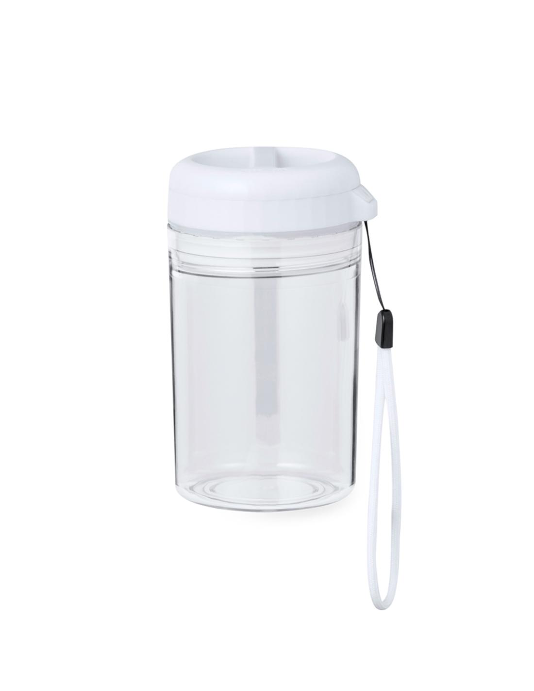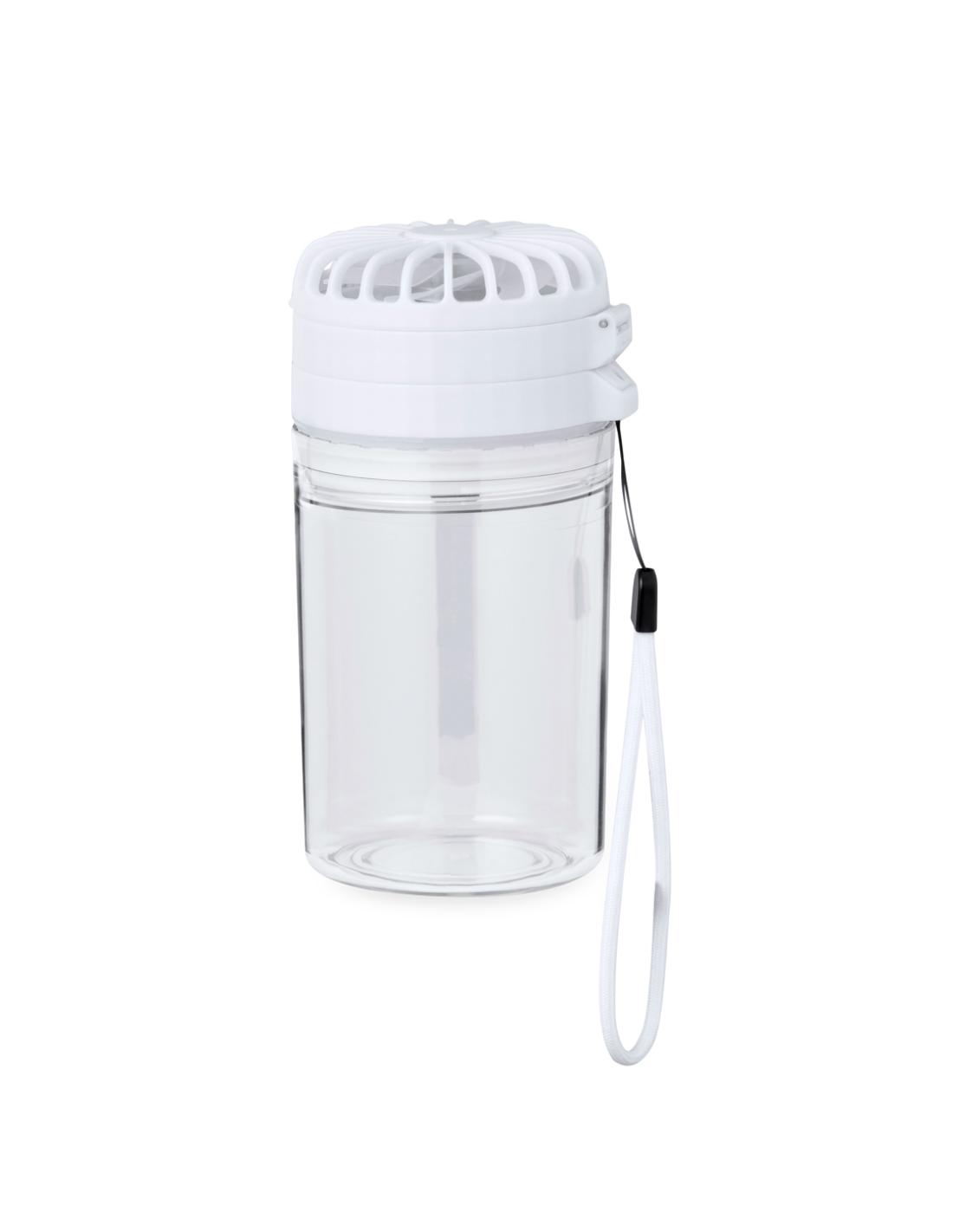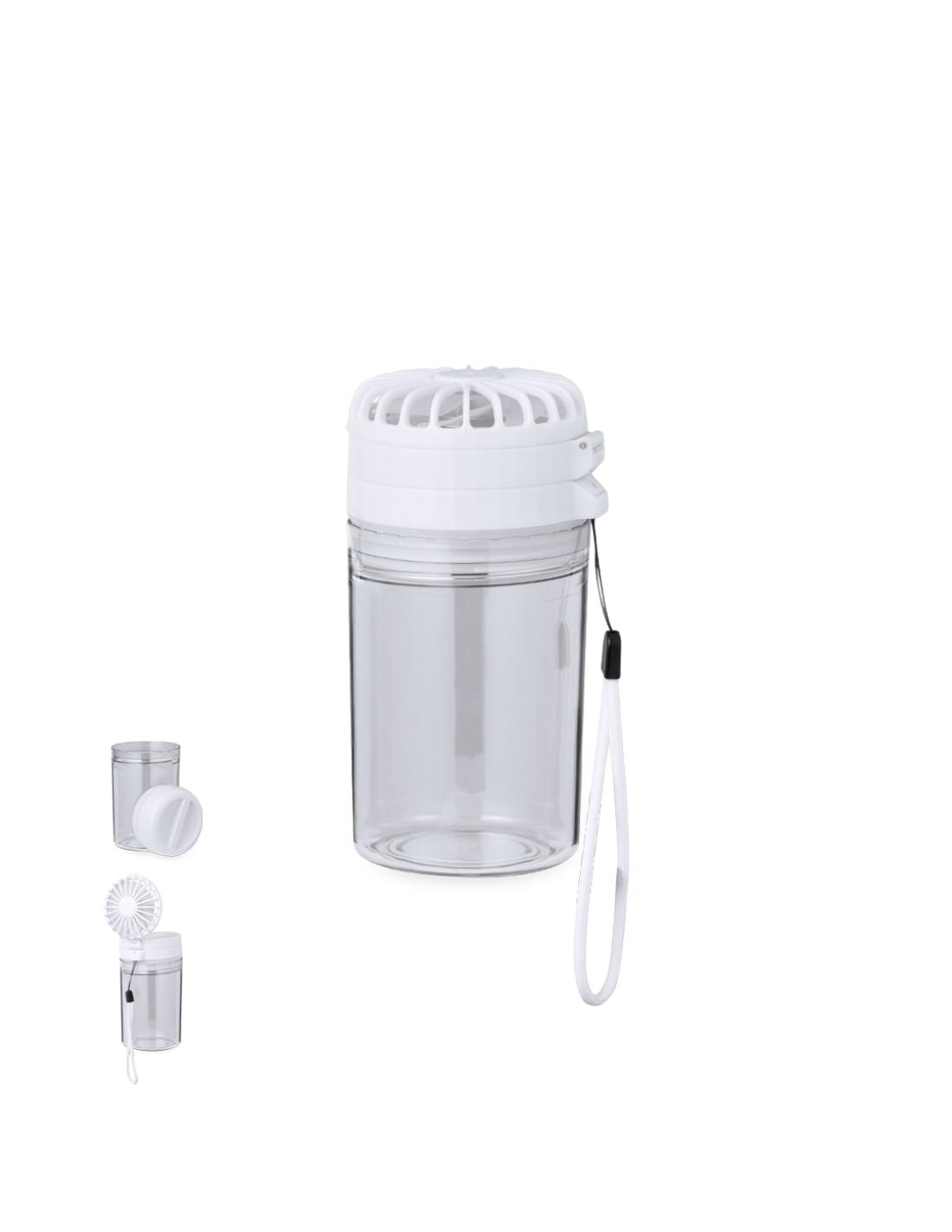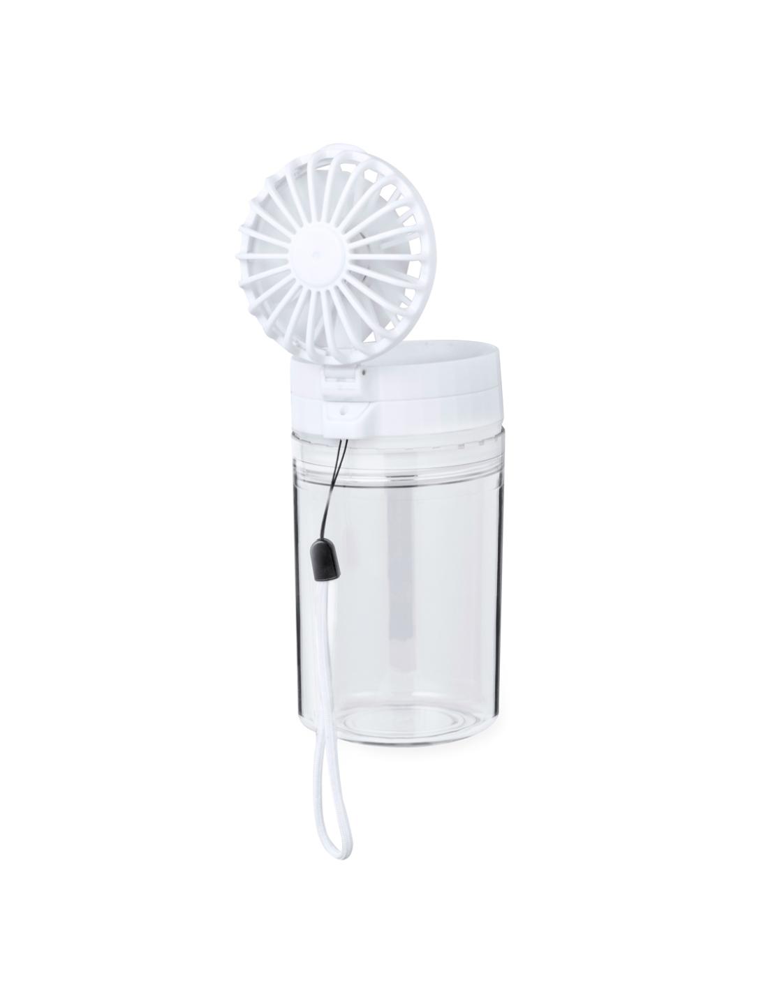 Práctico bidón con ventilador, fabricado en Tritan y de 350 ml de capacidad. Libre de BPA, con tapadera hermética de rosca que incluye un ventilador regulable en 3 niveles de intensidad y posición. Con batería de 1200 mAh y una tapadera extra para poder usar por separado. Incluye cordón para transportarlo fácilmente y viene presentado individualmente en caja kraft.