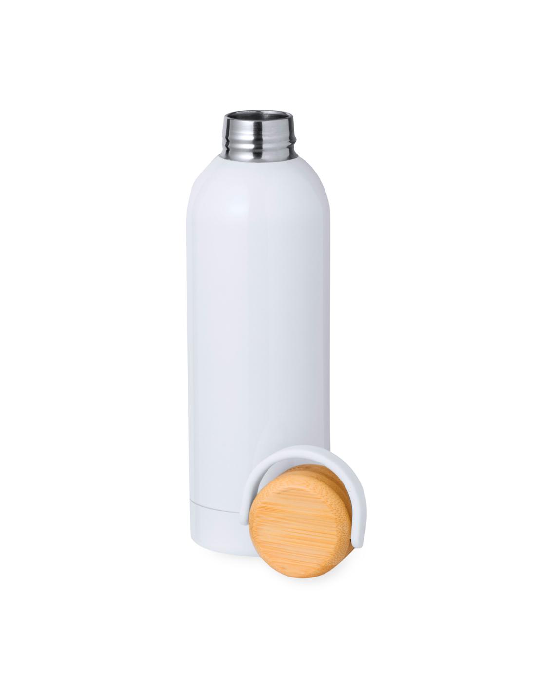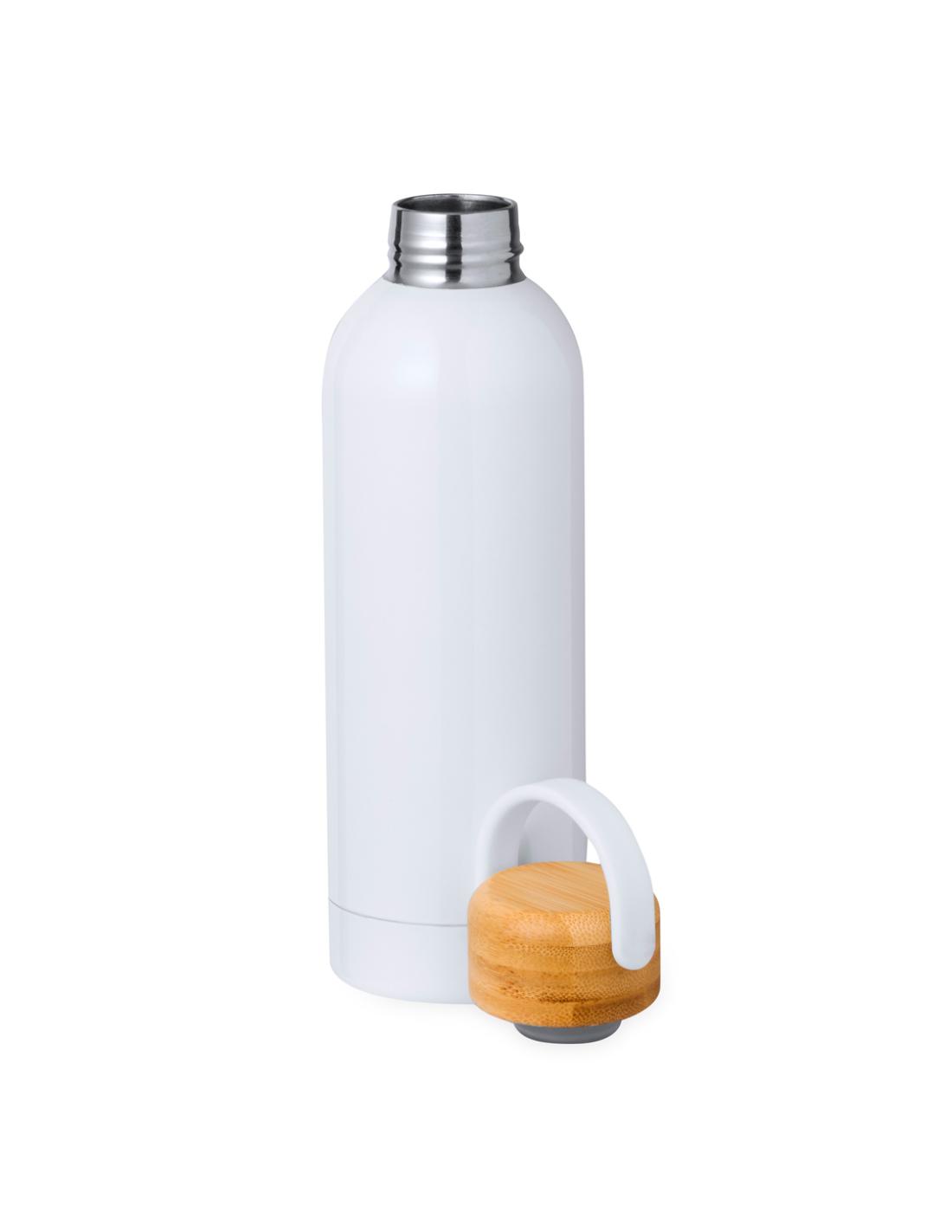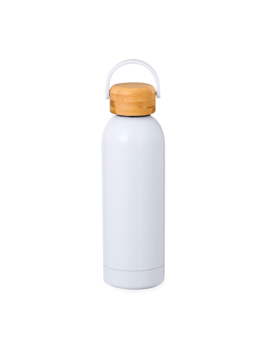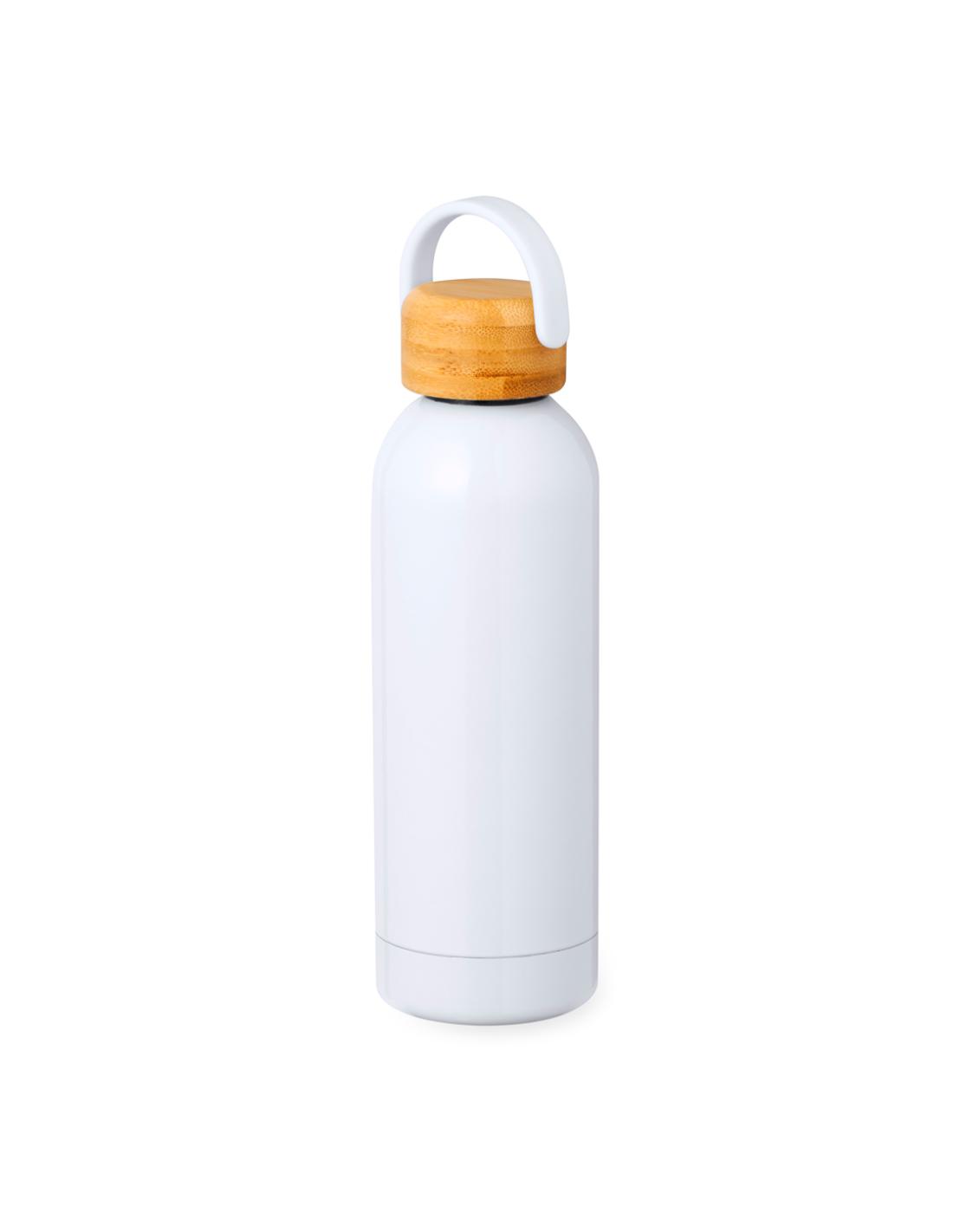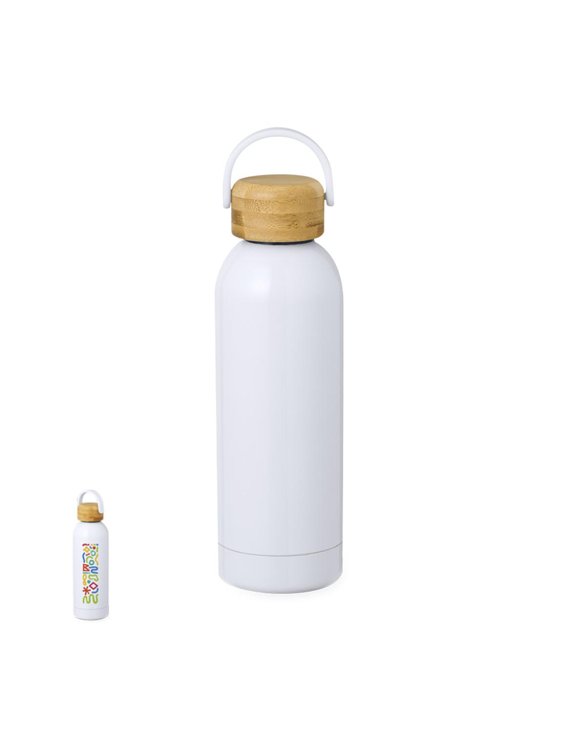 Bidón térmico de 500 ml de capacidad, fabricado en acero inox de doble pared y especialmente diseñado para marcaje en sublimación. De acabado blanco brillo, con tapón a rosca y asa superior para un fácil agarre, libre de BPA. Presentado en caja individual de diseño kraft.