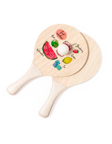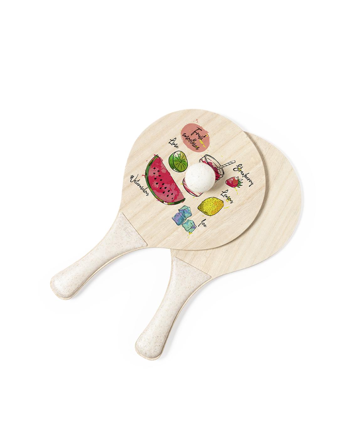 Par de palas de playa especiales para la sublimación. Fabricadas en madera, con mango reforzado en caña de trigo. Zona especial para la sublimación en la parte plana de la pala con posibilidad de diseños a todo color. Logotipo en el mango. Presentadas en bolsa de rejilla, con pelota de caña de trigo.La caña de trigo fomenta la utilización de materias primas naturales, reduciendo así las emisiones contaminantes.