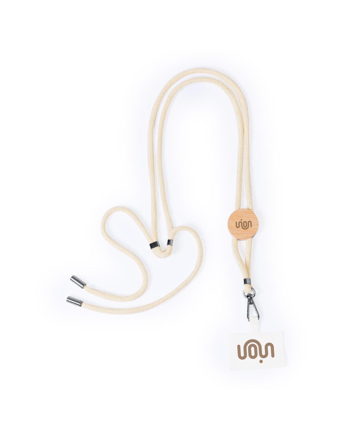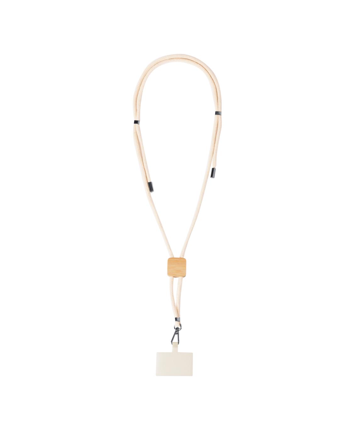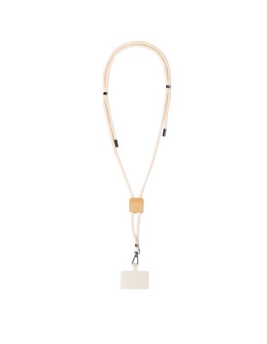 Original lanyard con accesorio para smartphone. Fabricado en resistente algodón, con accesorio de bambú para marcaje. Accesorio de transporte para situar entre la funda y el smartphone y mosquetón giratorio metálico. Ajustadores en cuello, con accesorios cromados en los extremos de los cordones de ajuste.Materiales como el bambú fomentan la utilización de materias primas naturales, reduciendo las emisiones contaminantes. Proviene de una planta de gran resistencia y versatilidad, con crecimiento y regeneración rápidos, siendo una excelente alternativa al uso de madera tradicional.