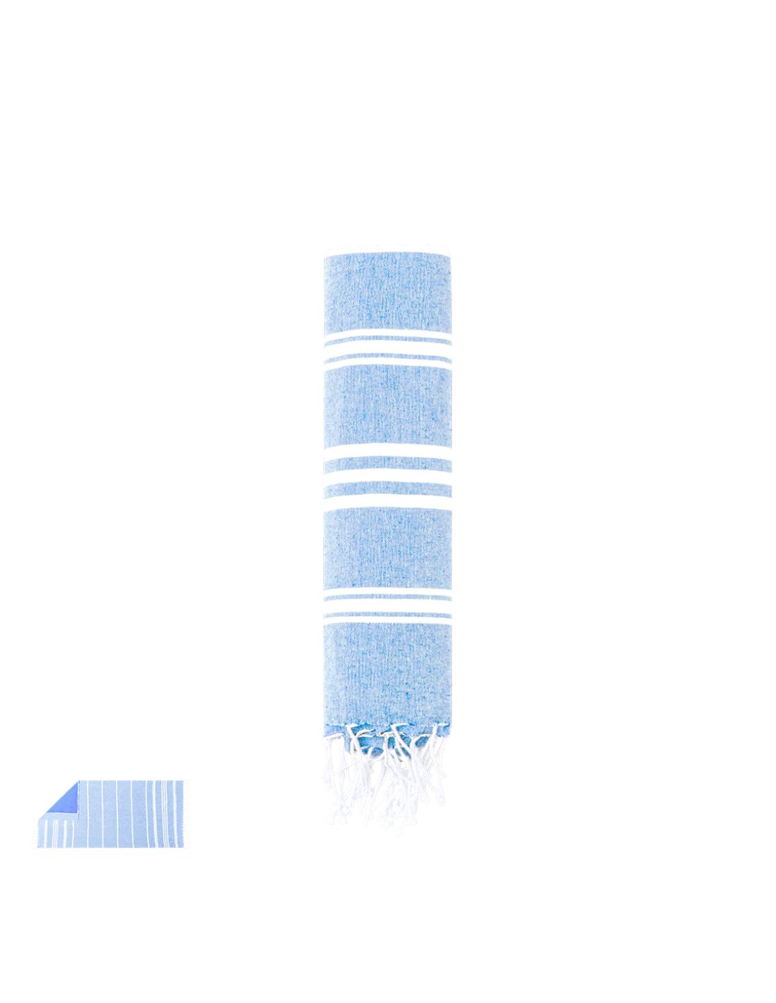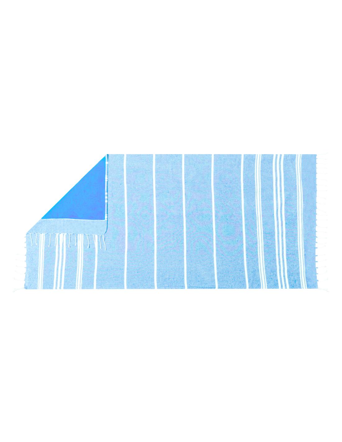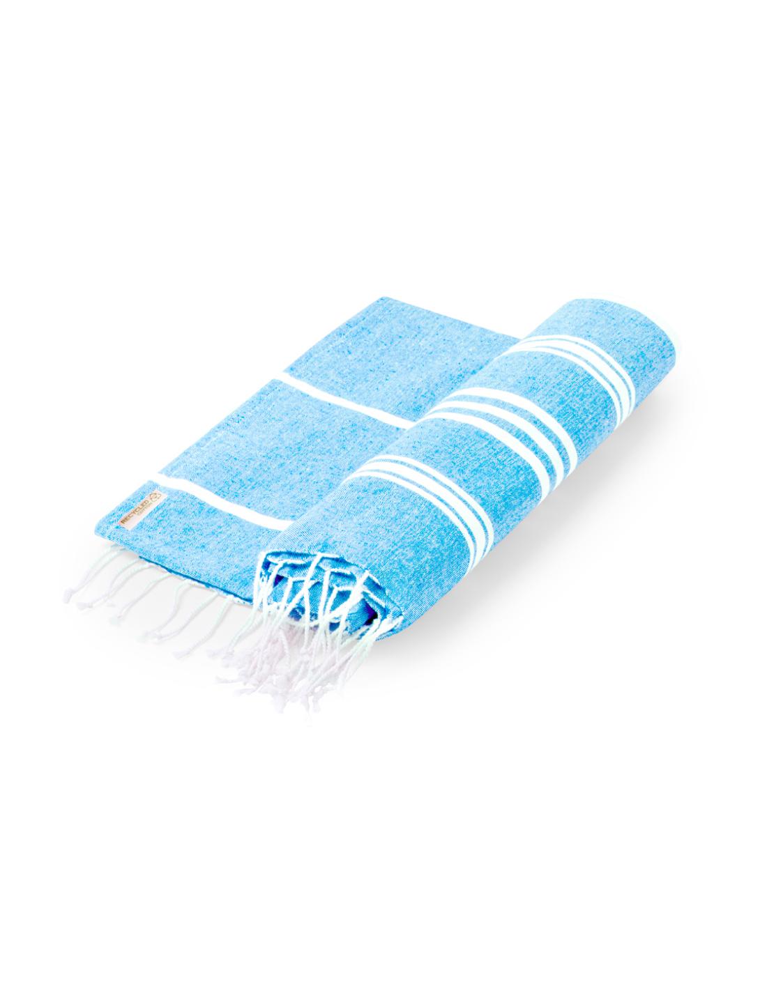 Suave pareo toalla en combinación de algodón reciclado de 130g/m2 en el frontal y poliéster de 125g/m2 en la parte trasera. Disponible en variada gama bicolor, con etiqueta lateral. Presentado en bolsa individual.