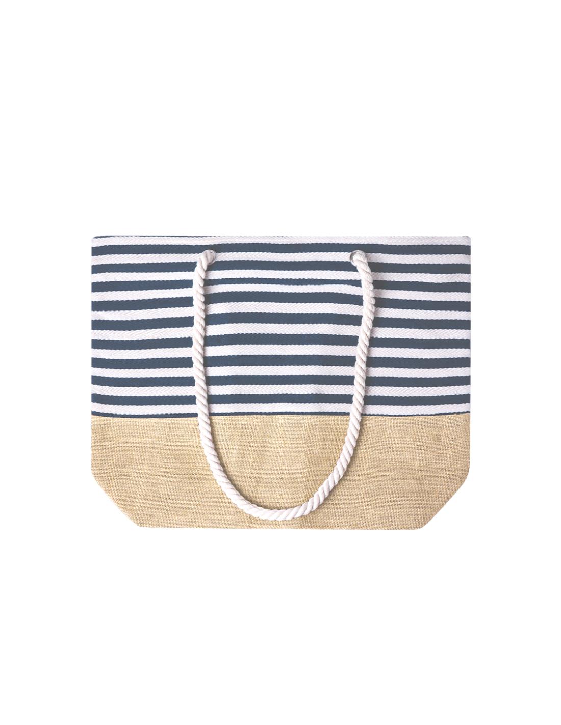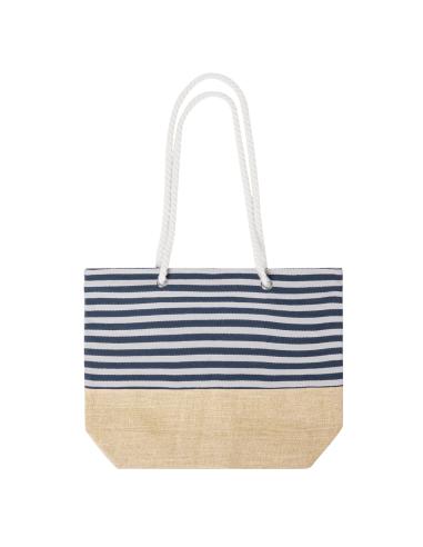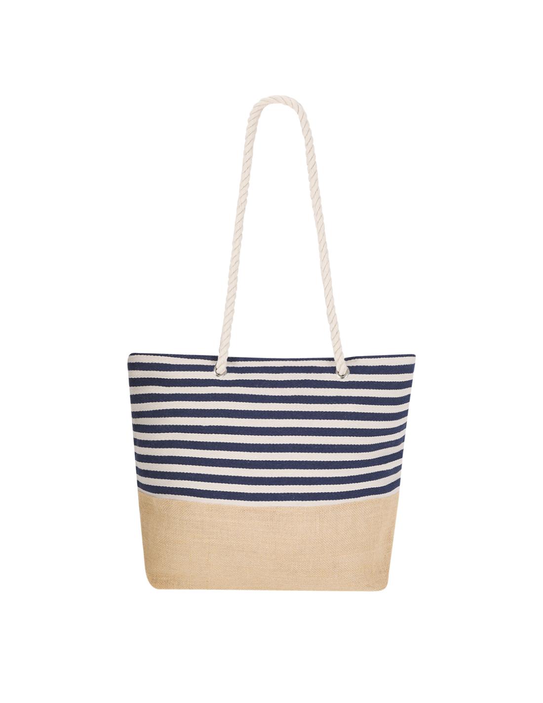 Bolsa fabricada en resistente algodón de 450g/m2 y base de yute. De acabado cosido, cierre de cremallera, con distinguido diseño a rayas blancas y azules. Asas largas hechas en algodón de color blanco en forma de cuerda reforzadas con argollas. Resistencia hasta 13kg de peso.