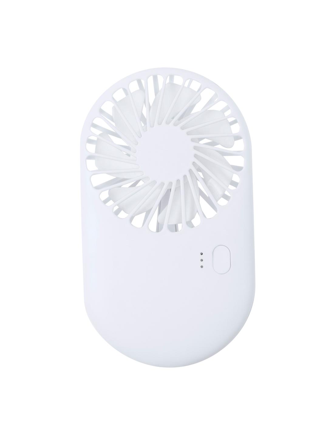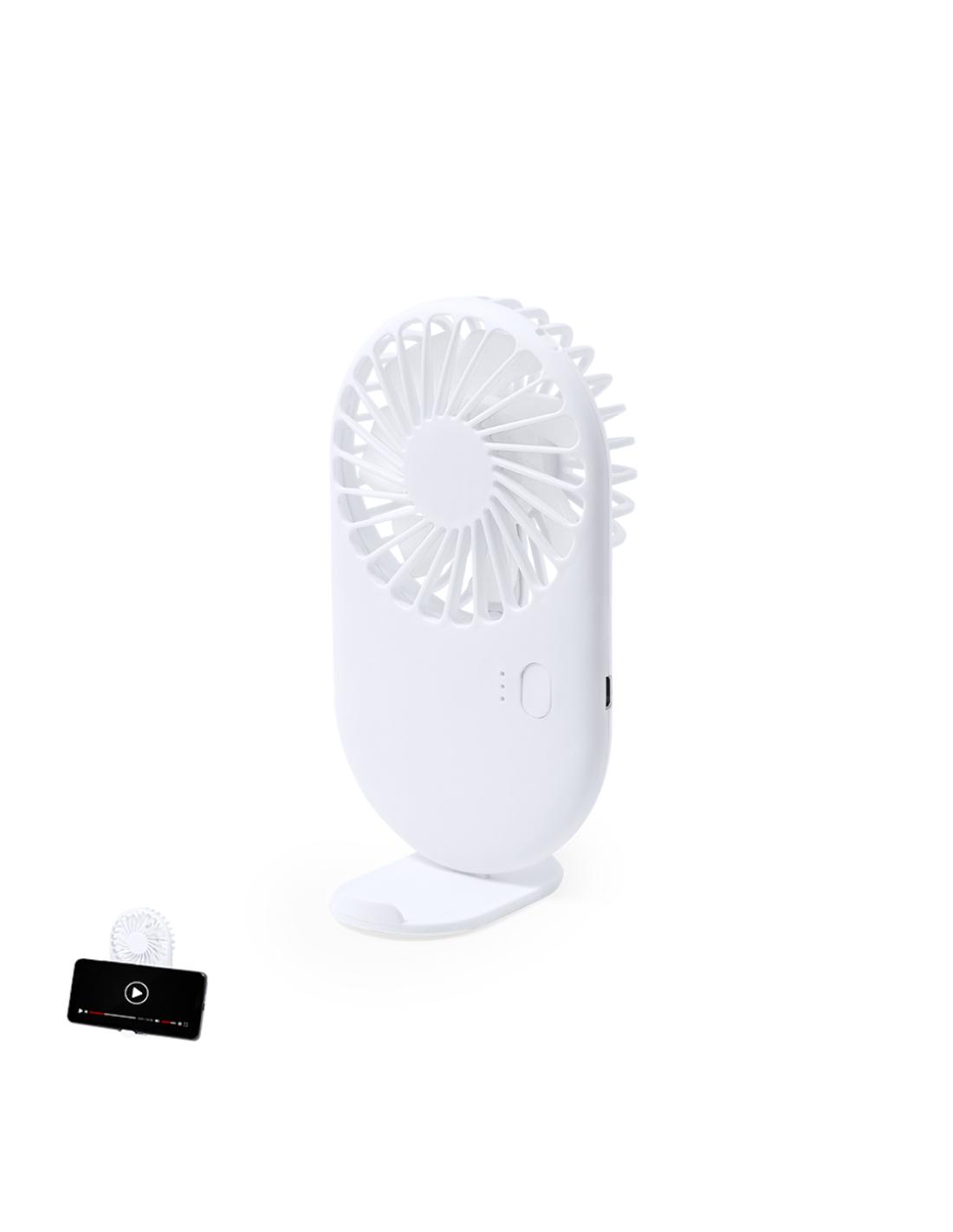 Ventilador portátil fabricado en resistente ABS. Cuenta con tres velocidades y soporte integrado para smartphone. Se alimenta mediante una batería de 300 mAh, con indicadores de luz que muestran el nivel de carga y cable Micro USB incluido. Presentado individualmente en caja de diseño kraft.