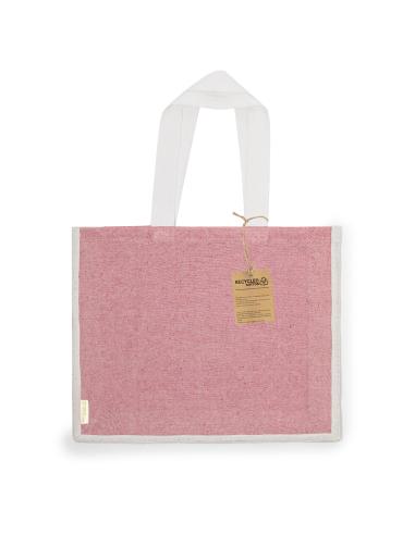 Bolsa en material 100% algodón reciclado de 140 g/m2 en combinación con el yute. Asas largas de 70cm con refuerzo, de acabado cosido y fuelle de yute. Logotipo en etiqueta lateral y resistencia hasta 8 kg de peso. Disponible en variada gama de colores nature con base de color natural.
