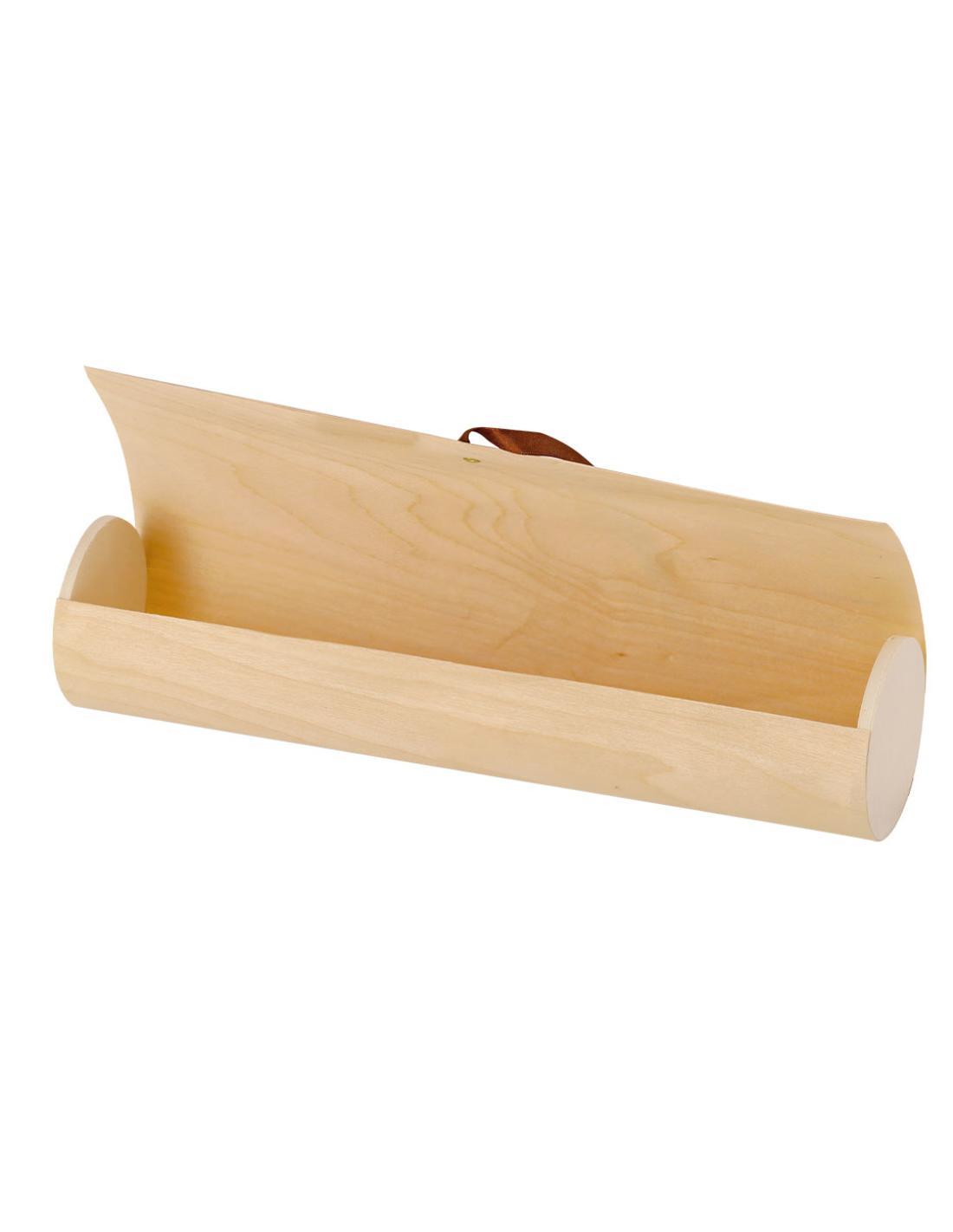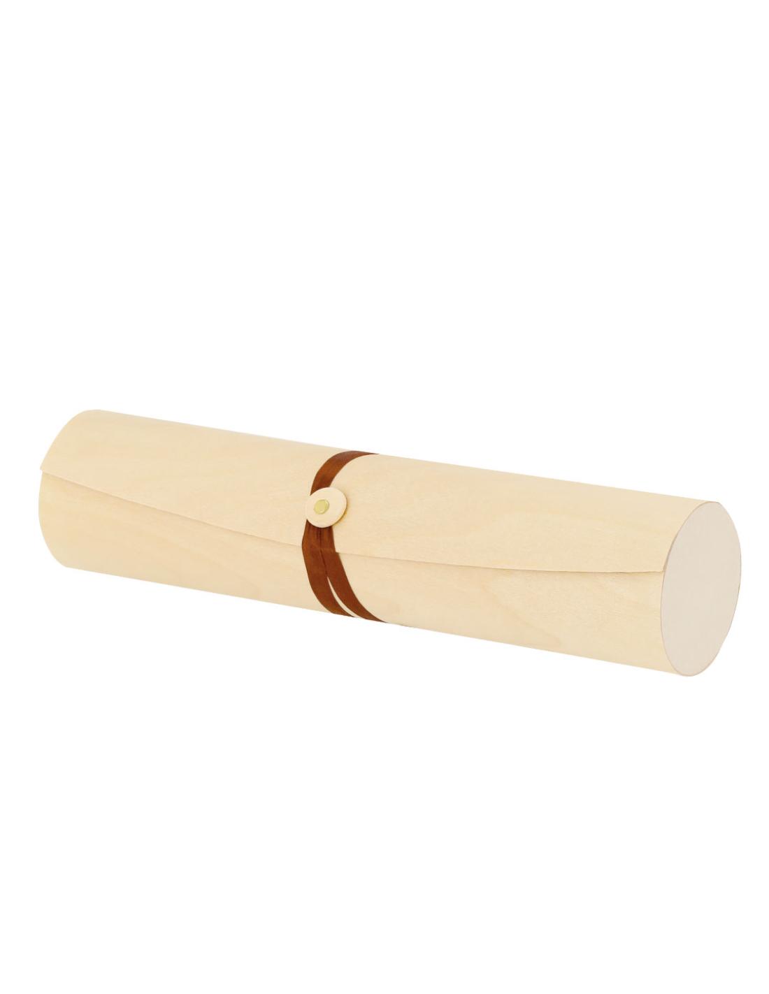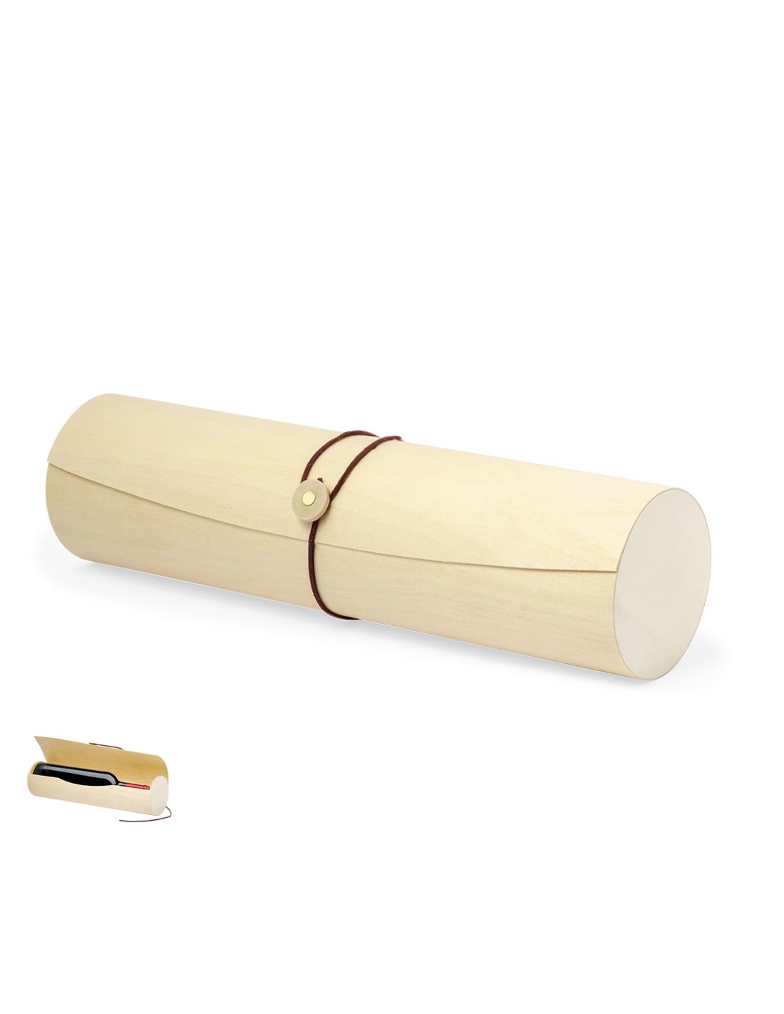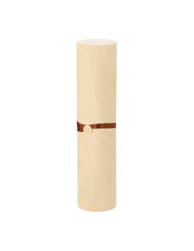 Elegante caja de presentación fabricada en madera. Forma cilíndrica con tapadera de suave madera y cierre de cuerda en polipiel. Presentado en caja de diseño kraft.