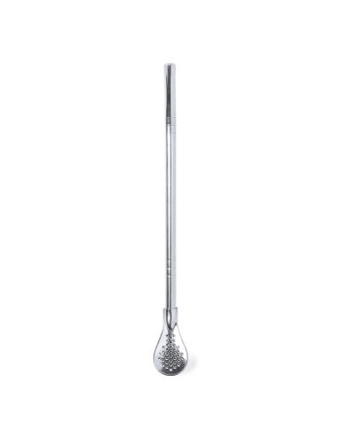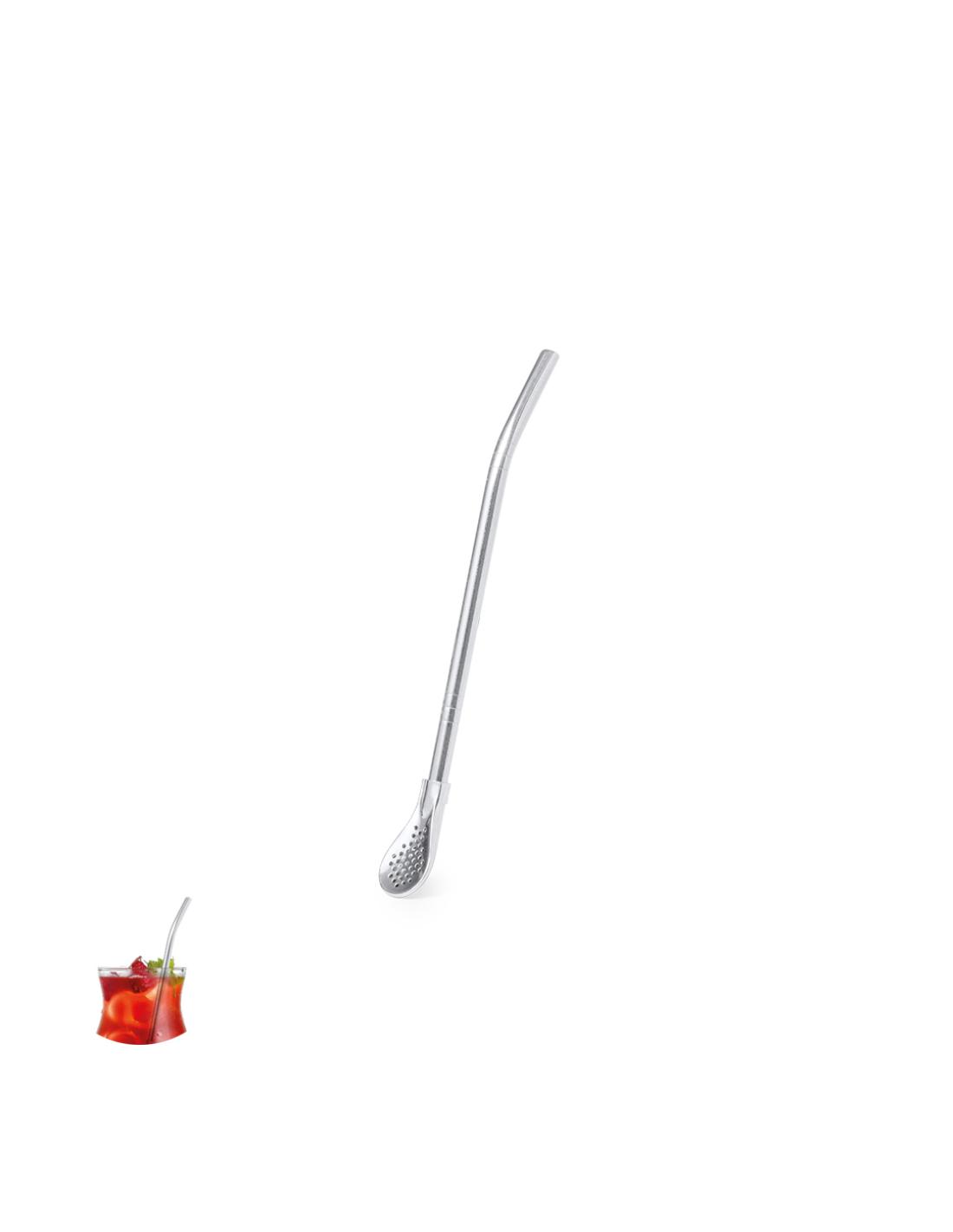Práctico agitador con pajita en acero inox. Con diseño elegante y funcional, este accesorio es esencial para bebidas frías o calientes. Pajita integrada que permite absorber con facilidad y en el extremo inferior una práctica cucharilla con filtro. Presentado en una bolsa individual.