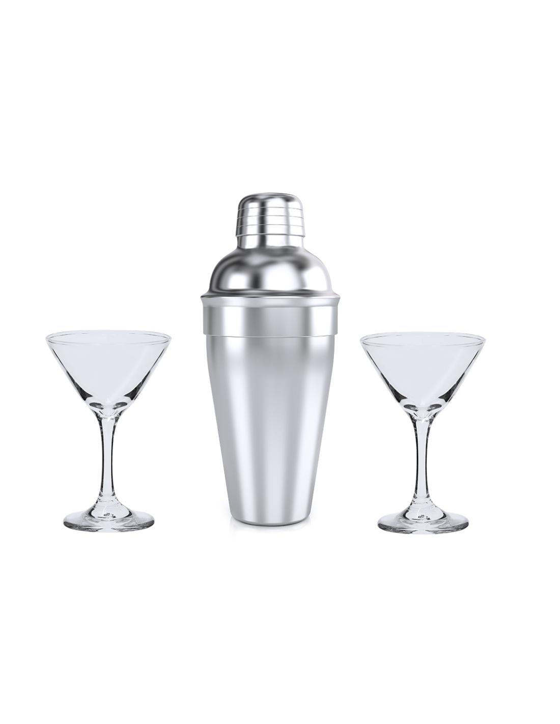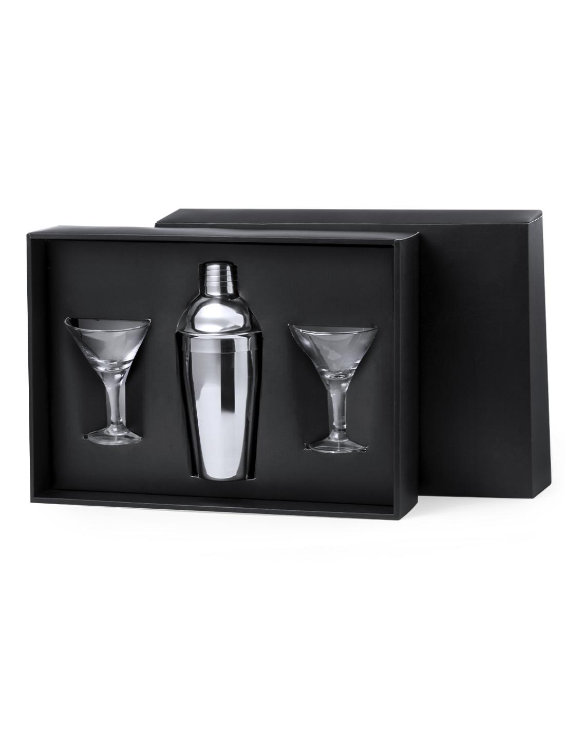 Elegante set de coctel. Conjunto de coctelera en acero inox de 550 ml para preparar las mejores mezclas de bebidas. Además, contiene 2 copas de cristal de 150 ml cada una y de elegante diseño triangular, para una presentación exquisita. Presentado en caja negra.