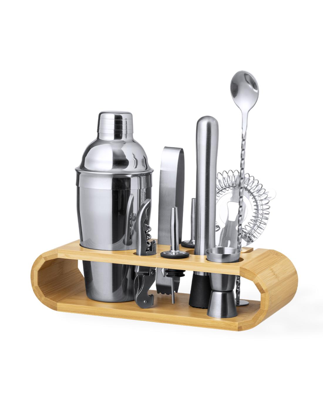Elegante set de cóctel en acero inox. Completo set que combina conceptos modernos a la par que tradicionales. Incluye todos los utensilios esenciales para configurar los mejores cócteles. Con original base de bambú para guardar y exponer todos los utensilios. Presentado en distinguida caja de diseño kraft.Accesorios incluidos:- 1 coctelera- 1 mortero- 1 vaso medidor de 15/30 ml- 1 pinza para hielo- 1 filtro- 1 abridor/sacacorchos- 1 cucharilla mezcladora- 2 tapones dosificadores