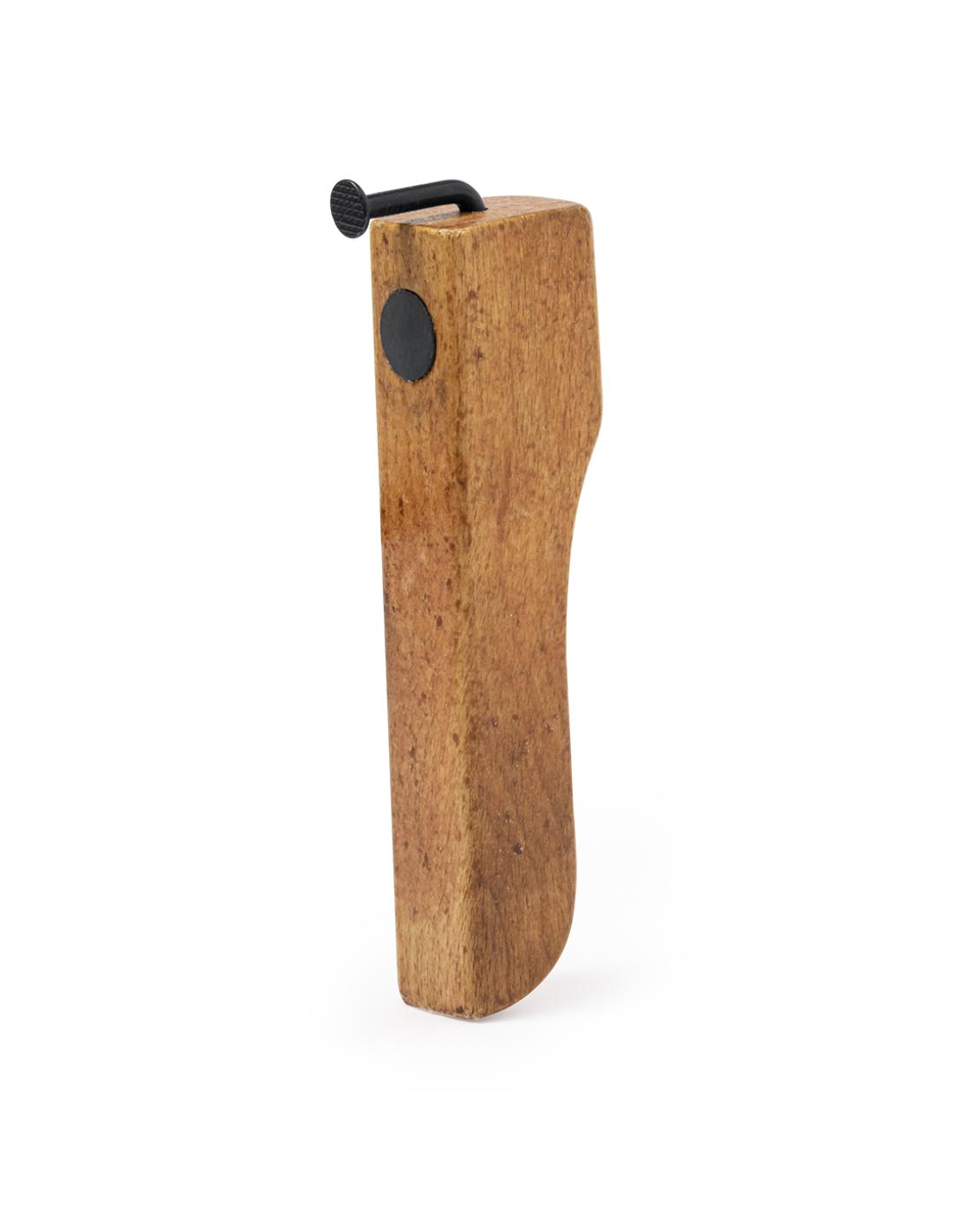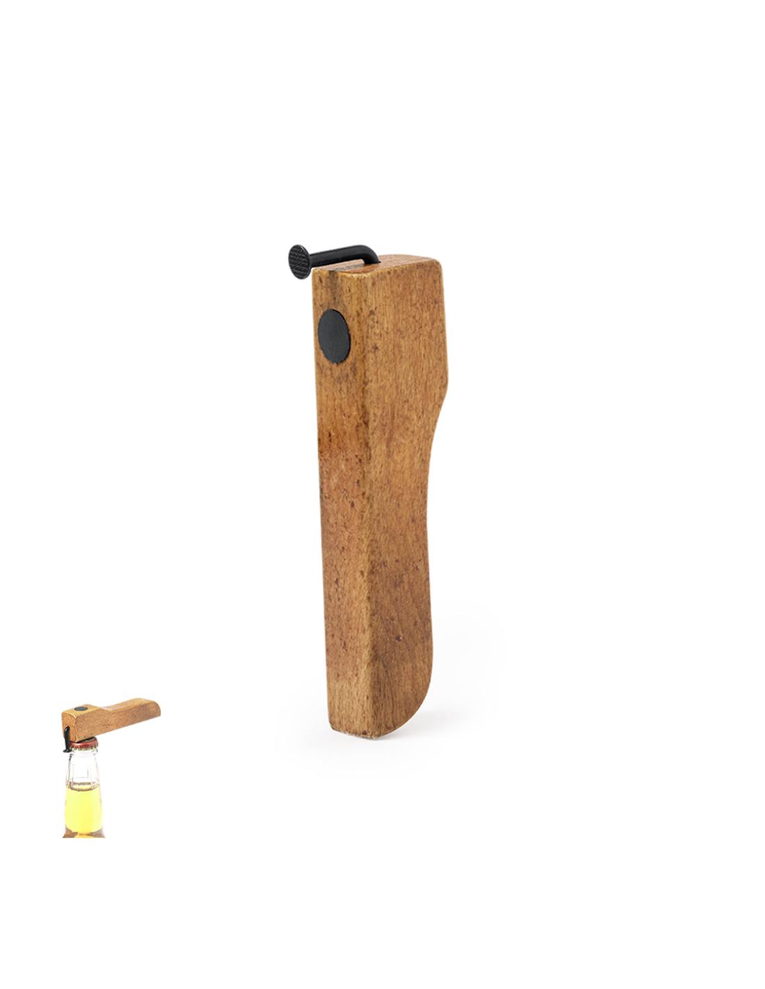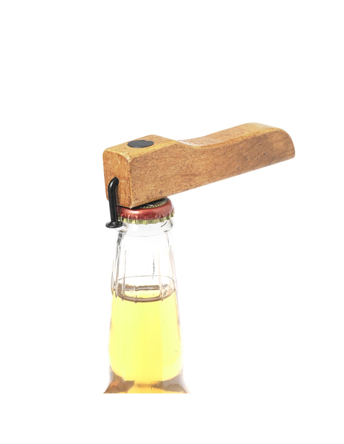 Original abridor de botellas en madera. De diseño industrial, fabricado en suave madera natural con abridor en forma de clavo y prácticos imanes para sujetar la chapa y poder colocarlo en cualquier superficie metálica. Presentado en caja de diseño kraft.