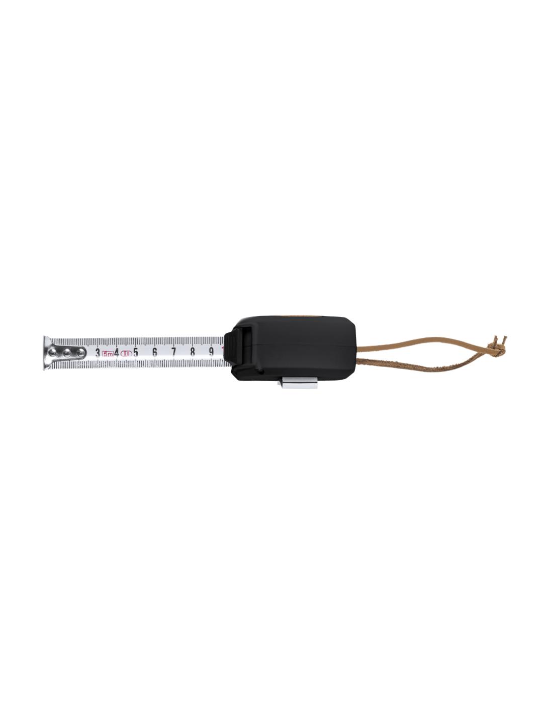 Flexómetro de 5 metros de línea nature, fabricado en combinación de bambú y ABS con tacto goma. Hoja metálica con freno, clip metálico para cinturón y cinta de transporte en PU. Con amplia superficie de marcaje y presentado en atractiva caja de diseño eco.