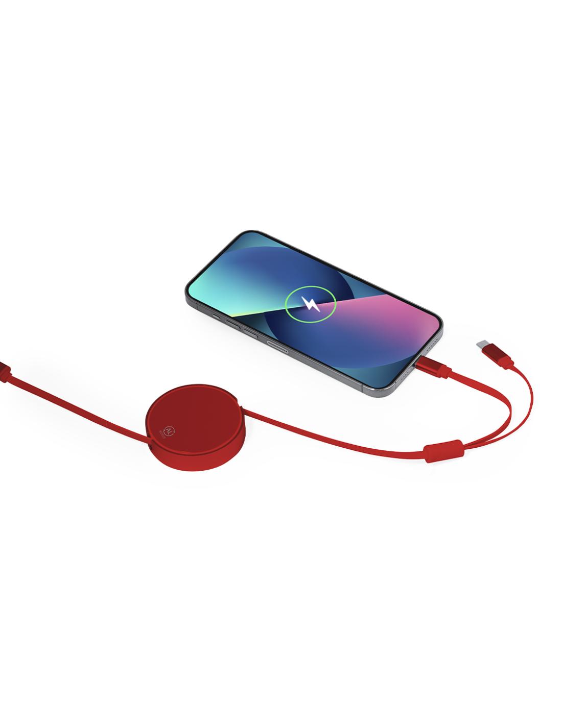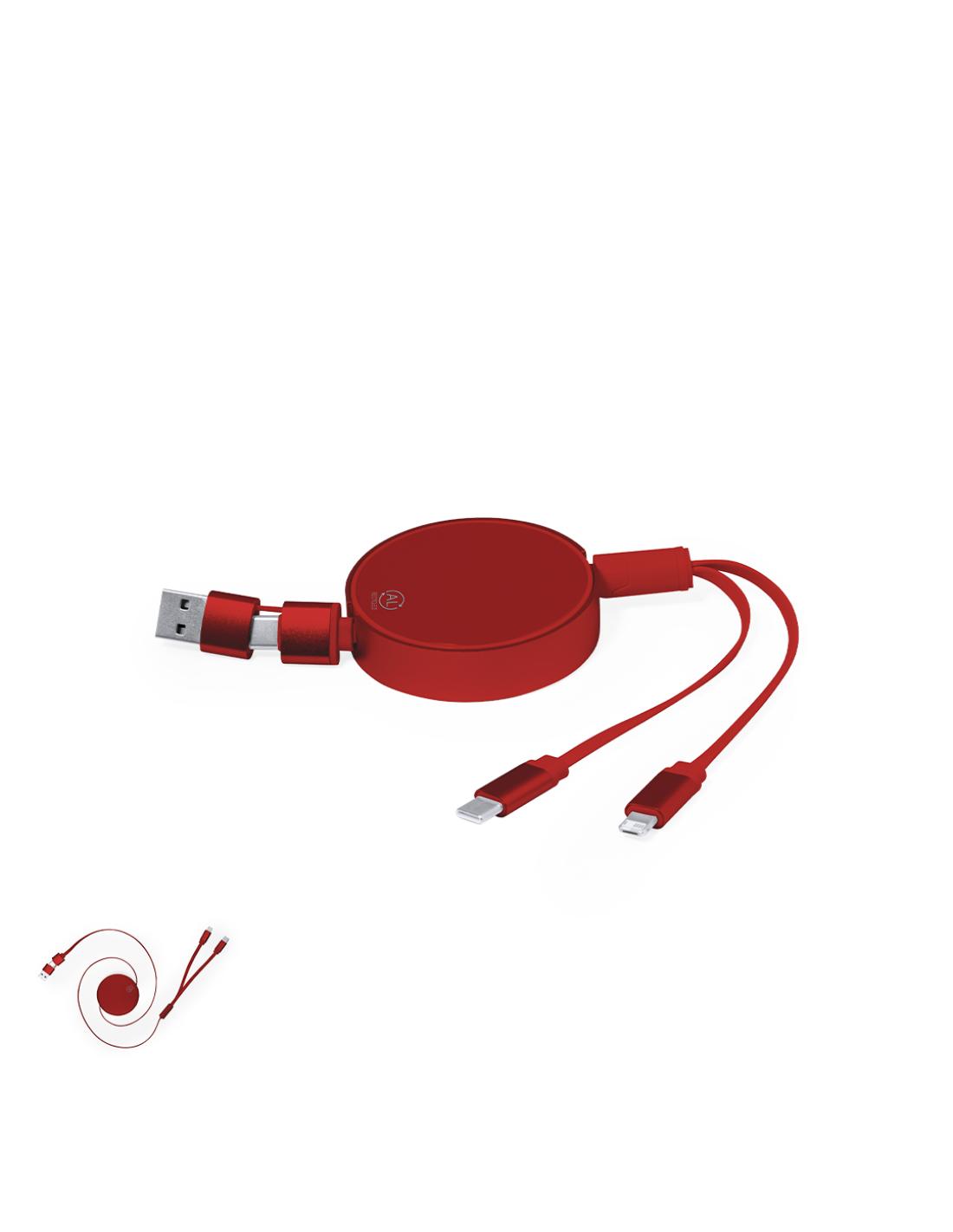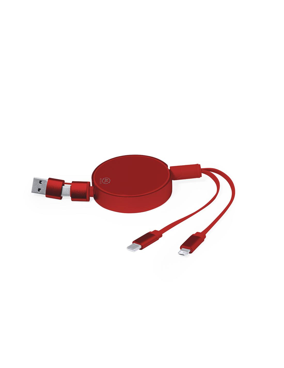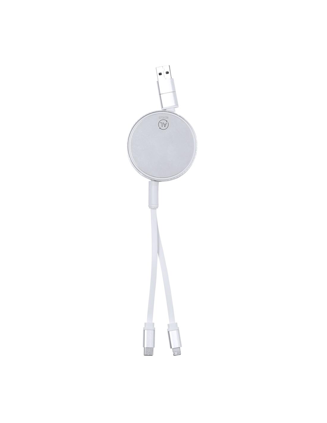 Cable cargador y sincronizador extensible, apto para transferencia de datos y fabricado en Aluminio Reciclado de acabado metalizado. Carcasa central con amplia superficie de marcaje, especialmente diseñada para grabado en láser. Disponible en variada gama de colores, con cables a juego. Conexiones de entrada Tipo C y USB, con salidas Lightning, Micro USB y Tipo C. 5V DC 2.4A. Presentado en bolsa individual de diseño kraft.El Aluminio Reciclado es un material con posibilidades de reciclaje casi infinitas, sin perder sus propiedades originales y consumiendo menos energía en este proceso.Certificación GRS (Global Recycled Standard / Estándar de Reciclaje Global), que garantiza el origen reciclado del material usado para fabricar el producto.
