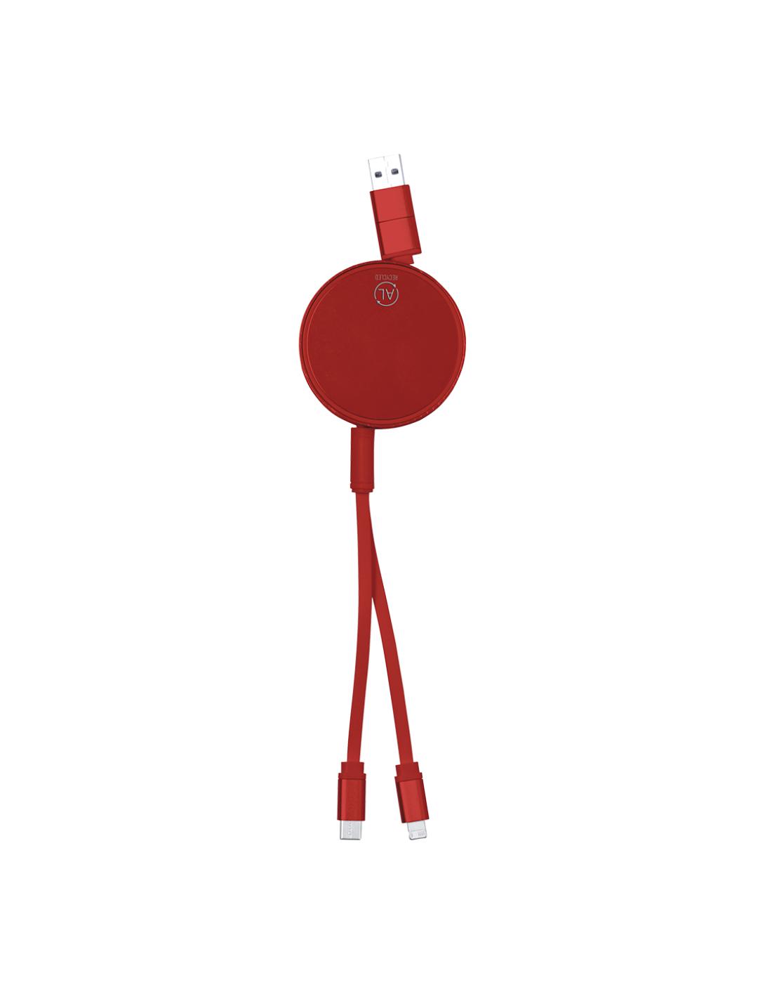 Cable cargador y sincronizador extensible, apto para transferencia de datos y fabricado en Aluminio Reciclado de acabado metalizado. Carcasa central con amplia superficie de marcaje, especialmente diseñada para grabado en láser. Disponible en variada gama de colores, con cables a juego. Conexiones de entrada Tipo C y USB, con salidas Lightning, Micro USB y Tipo C. 5V DC 2.4A. Presentado en bolsa individual de diseño kraft.El Aluminio Reciclado es un material con posibilidades de reciclaje casi infinitas, sin perder sus propiedades originales y consumiendo menos energía en este proceso.Certificación GRS (Global Recycled Standard / Estándar de Reciclaje Global), que garantiza el origen reciclado del material usado para fabricar el producto.