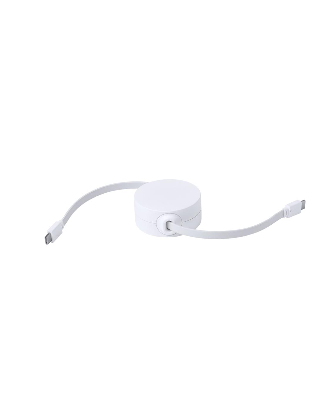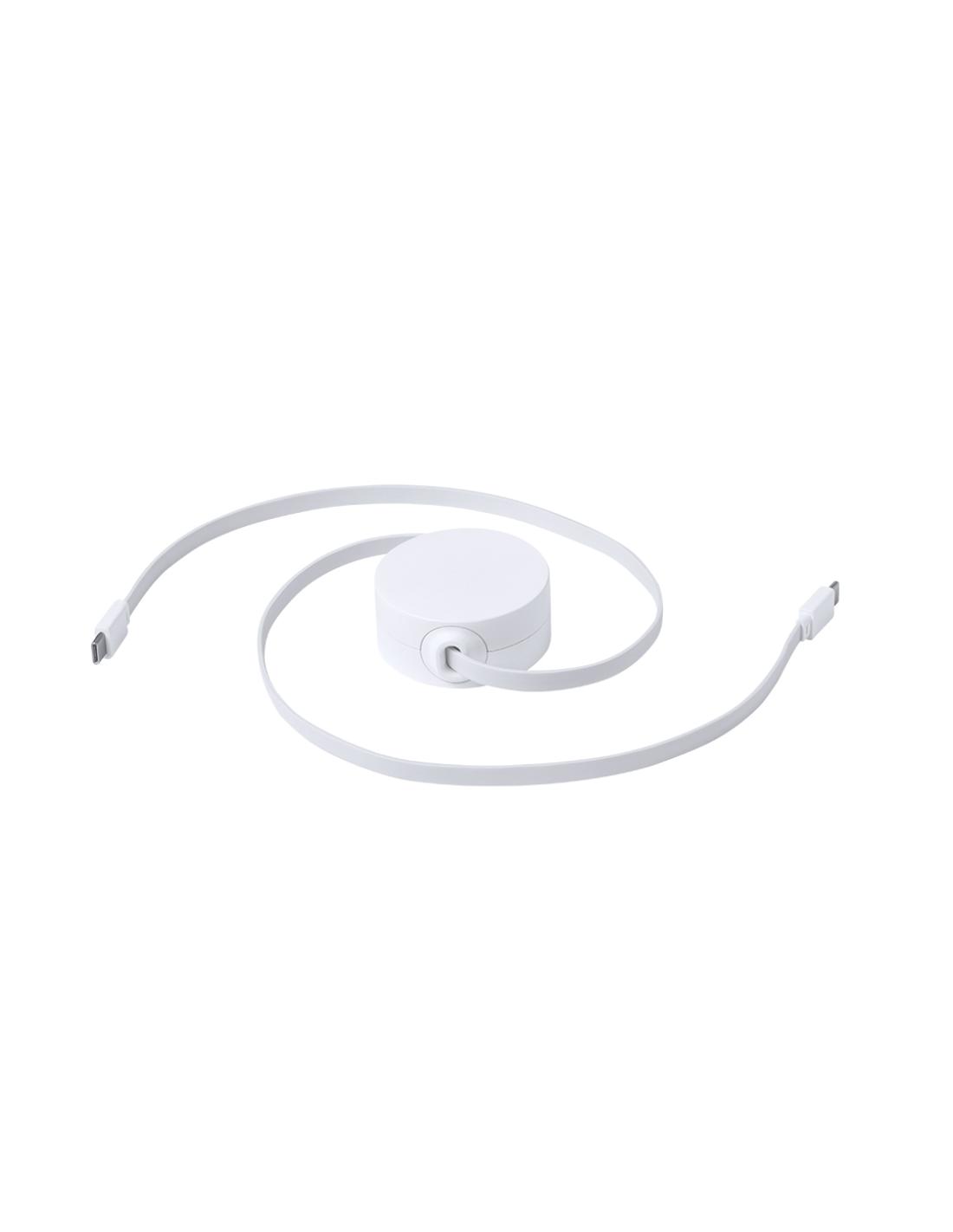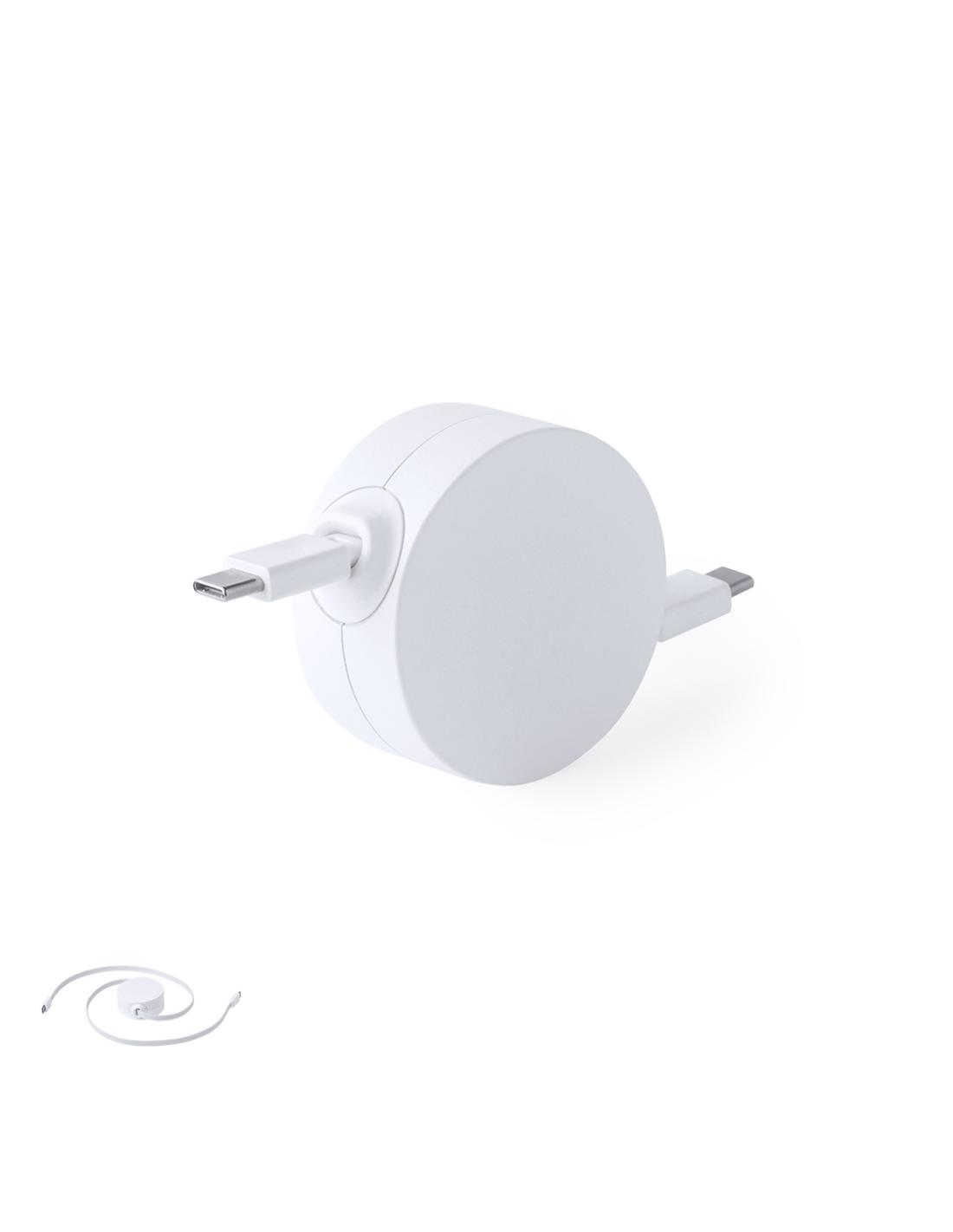 Cable cargador y sincronizador extensible, válido para cargar dispositivos y transferir datos. Fabricado en resistente RABS de color blanco. Pieza central con amplia zona de marcaje y mecanismo interior extensible. Incluidas conexiones de entrada y salida Tipo C. Presentado en bolsa individual de diseño kraft.El RABS es un plástico altamente reciclable de gran resistencia y con multitud de aplicaciones que lo convierten en una solución eco-friendly. Con certificación RCS, que garantiza el origen reciclado del mismo.