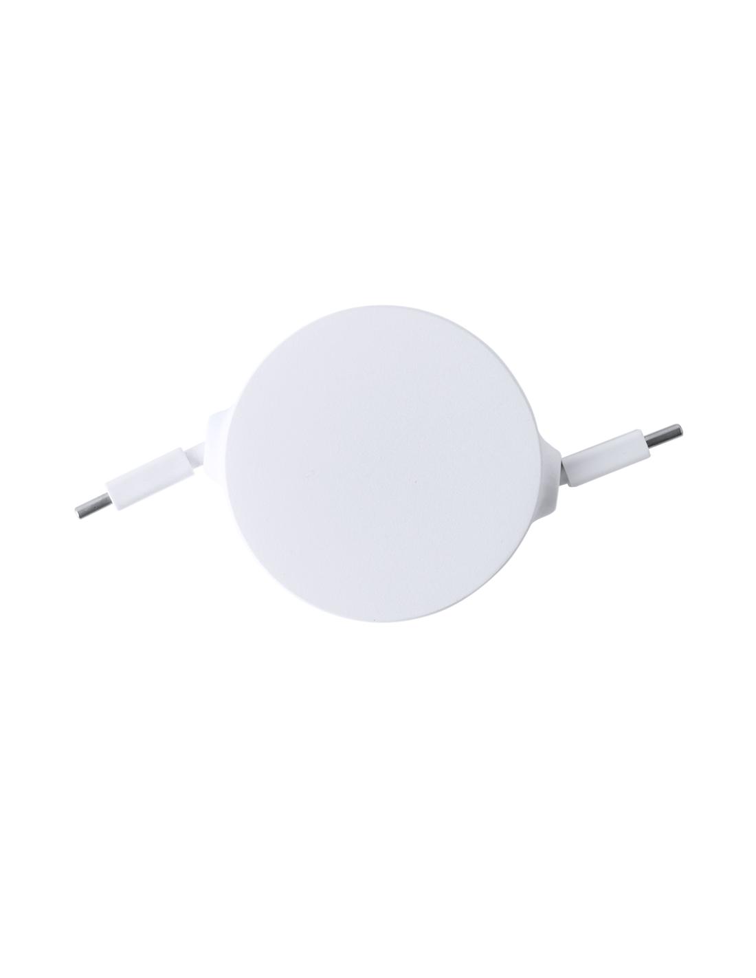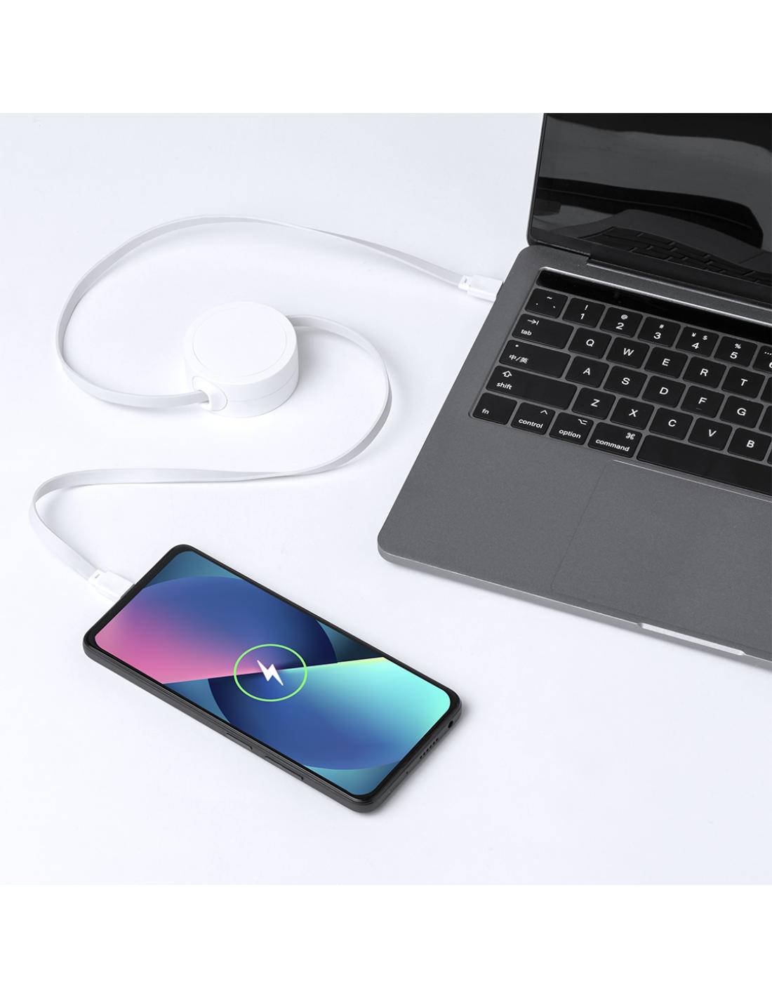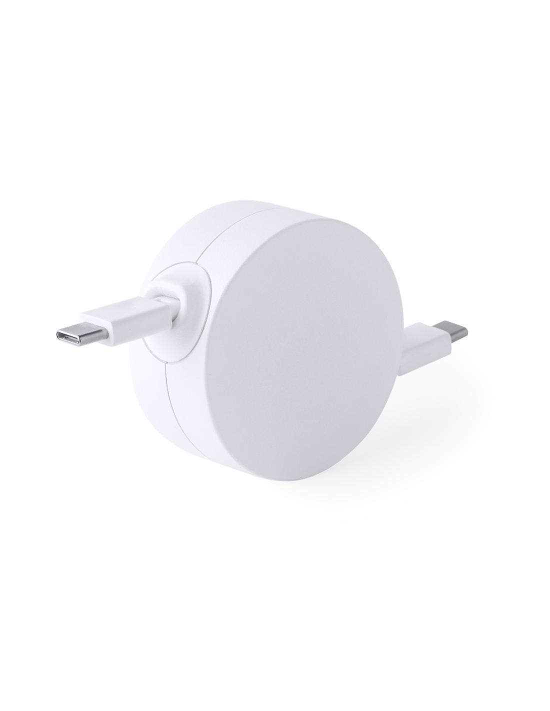 Cable cargador y sincronizador extensible, válido para cargar dispositivos y transferir datos. Fabricado en resistente RABS de color blanco. Pieza central con amplia zona de marcaje y mecanismo interior extensible. Incluidas conexiones de entrada y salida Tipo C. Presentado en bolsa individual de diseño kraft.El RABS es un plástico altamente reciclable de gran resistencia y con multitud de aplicaciones que lo convierten en una solución eco-friendly. Con certificación RCS, que garantiza el origen reciclado del mismo.