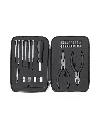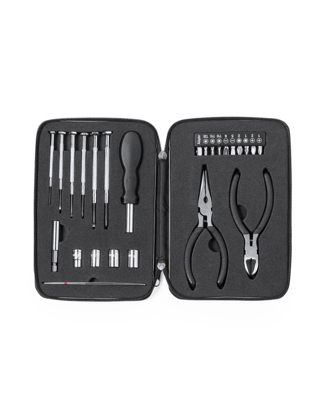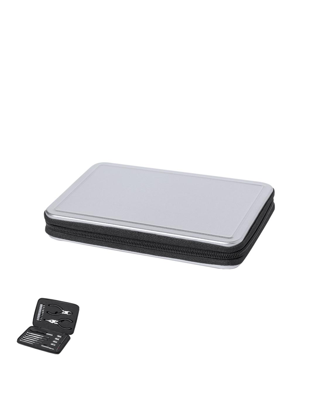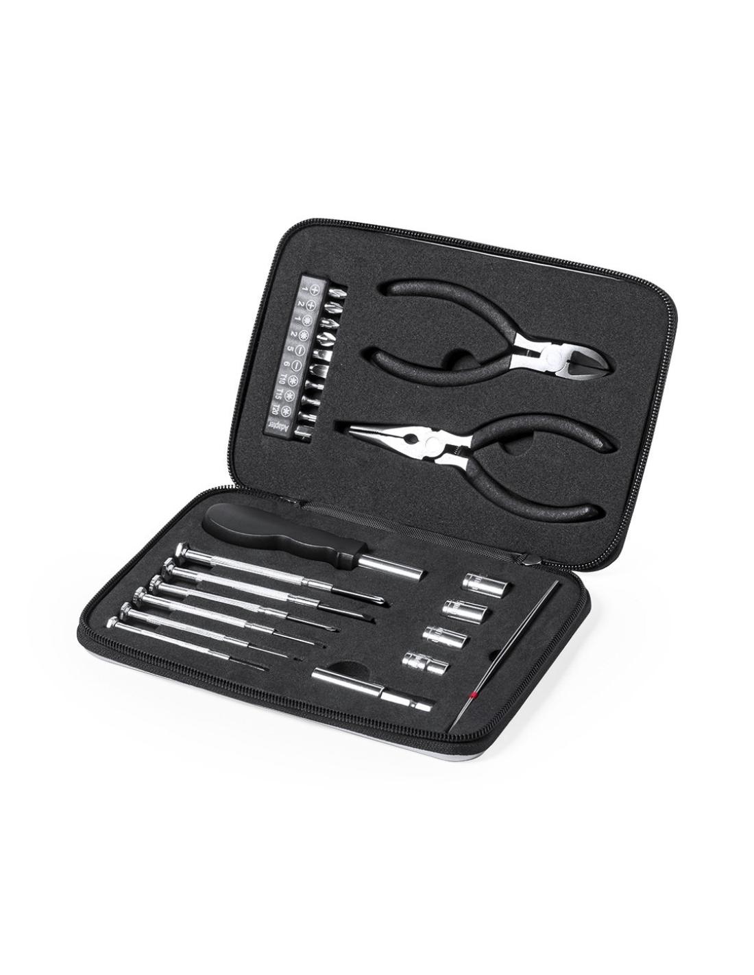 Set de herramientas de 25 accesorios en resistente estuche de aluminio con interior troquelado en EVA. Incluye set de destornilladores de precisión, mango multifunción, puntas intercambiables, destornilladores planos y de estrella cabezales de tubo pinzas y alicates. Presentado en caja individual.