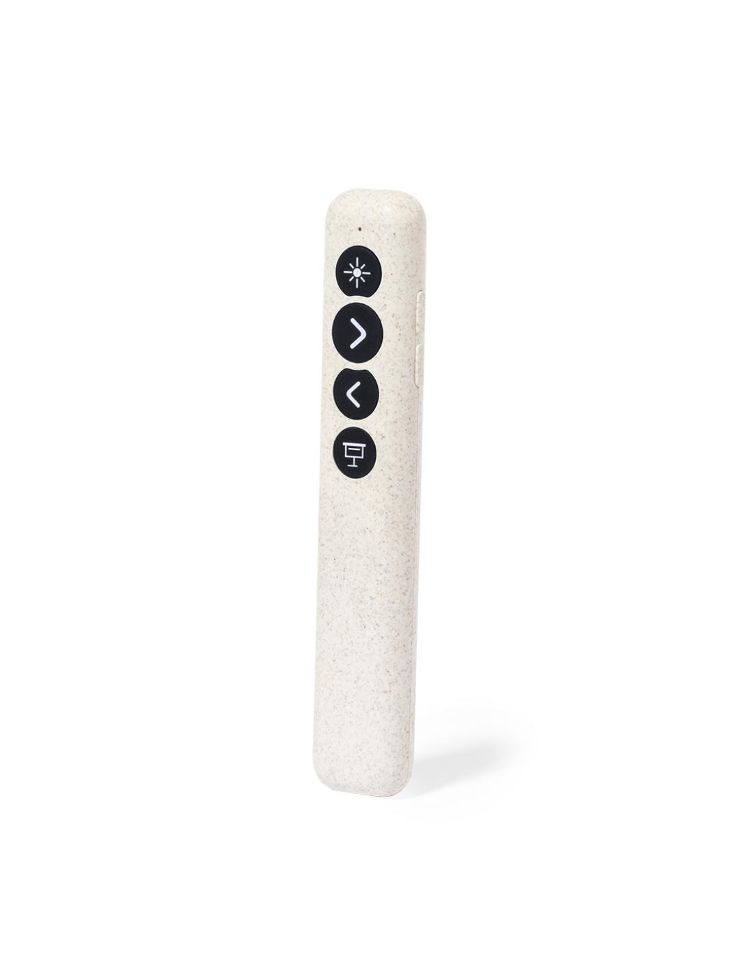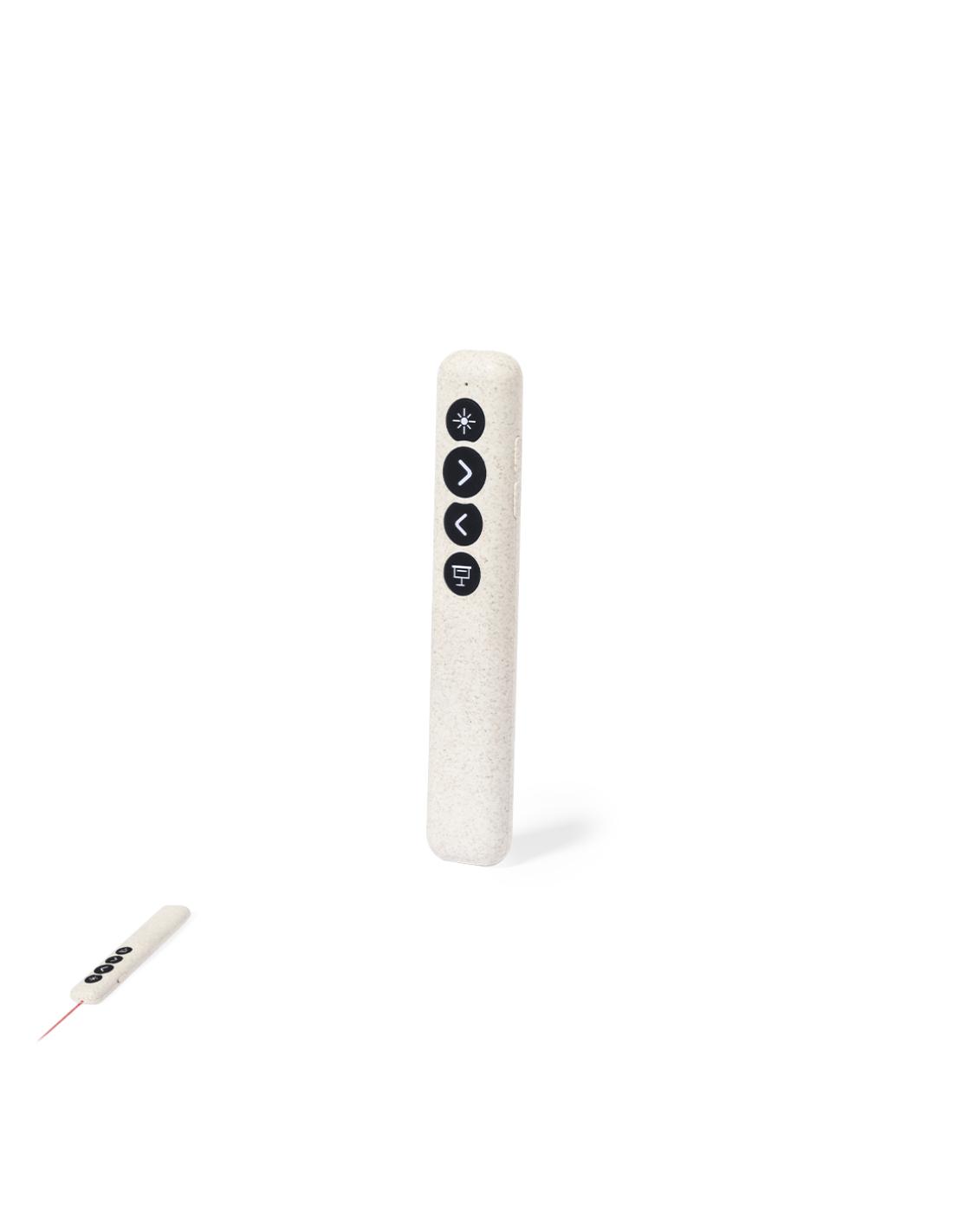 Elegante puntero láser de clase 2 con conexión USB fabricado en caña de trigo. Especialmente diseñado para presentaciones PowerPoint y Keynote, incorpora pulsador de activación lateral, con botones de avance, pausa y retroceso. Con cuerpo especialmente diseñado para marcaje en tampografía. Alimentación a pilas: 1xAAA incluida. Presentado en caja de diseño kraft, con manual de instrucciones en español e inglés.La caña de trigo fomenta la utilización de materias primas naturales, reduciendo así las emisiones contaminantes.