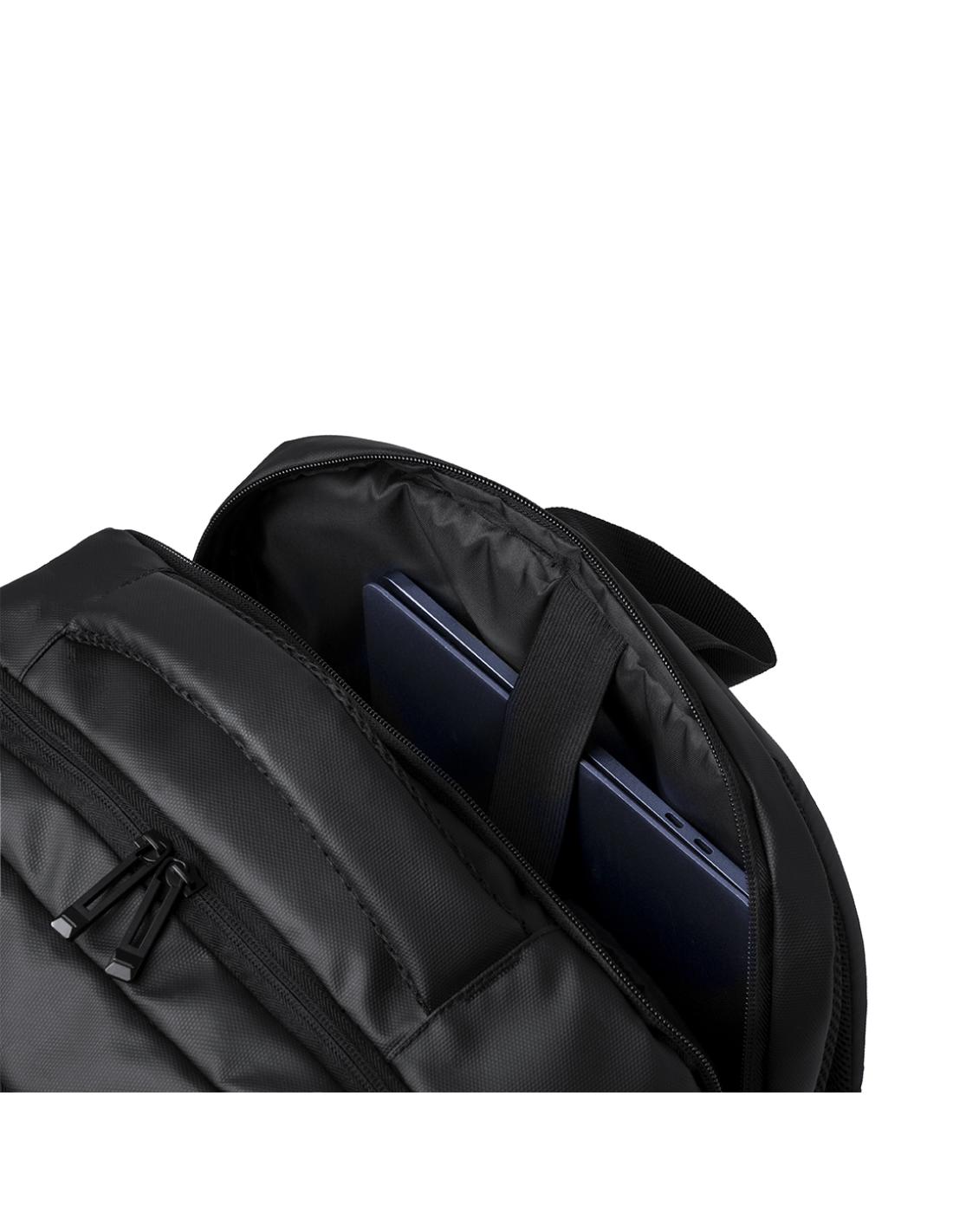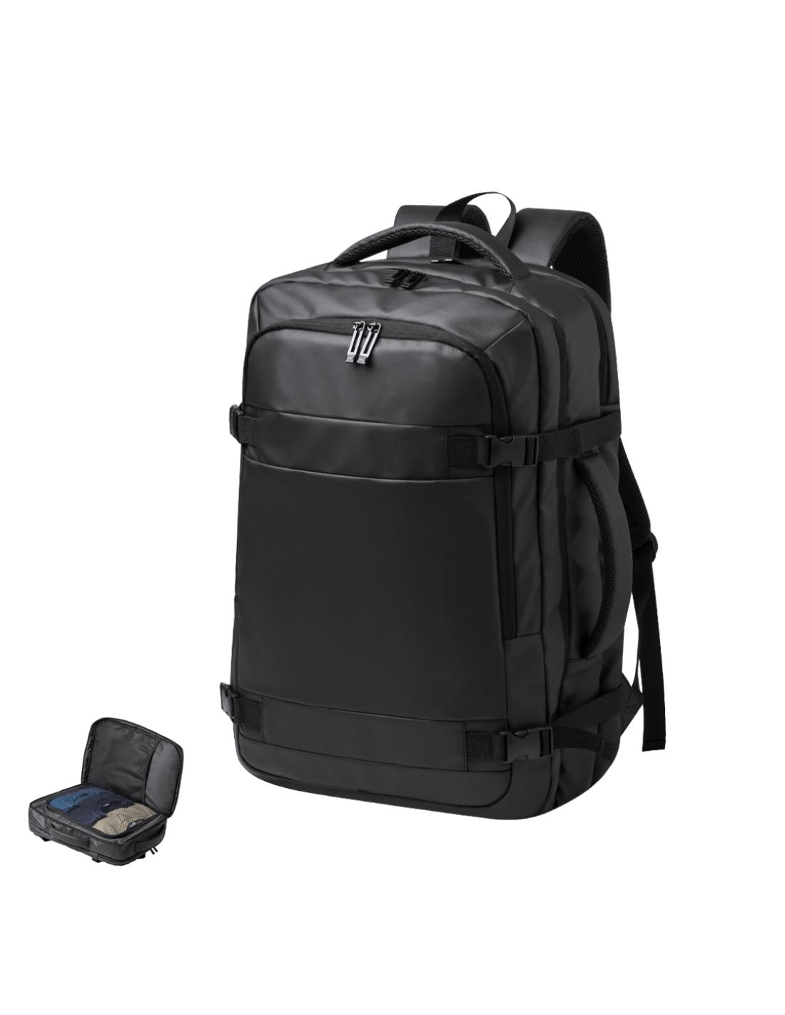 Mochila portadocumentos confeccionada en elegante polipiel. Presenta un diseño urbano que incluye un bolsillo acolchado para portátil de hasta 17 pulgadas. Reforzada con cintas laterales, cuenta con cierre de hebilla de seguridad y compartimentos con cierre de cremallera de doble tirador. Sus cintas de hombros y la espalda están acolchadas y son ajustables. Además, cuenta con un cinta para fijarla en trolley y una asa acolchada para mayor comodidad al usarla como portadocumentos. Presentado en una bolsa individual reciclada.