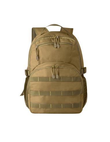 Mochila táctica en resistente poliéster 800D y en tonos marrón arena. Parte frontal con múltiples soportes elásticos para colgar los accesorios necesarios durante la aventura. Compartimento principal con cierre de cremallera de doble tirador y bolsillo. Incluye esquinas reforzadas, asa de transporte y bolsillos laterales de rejilla. Con espalda y cintas de hombros acolchadas y ajustables, presentada individualmente en bolsa reciclada.