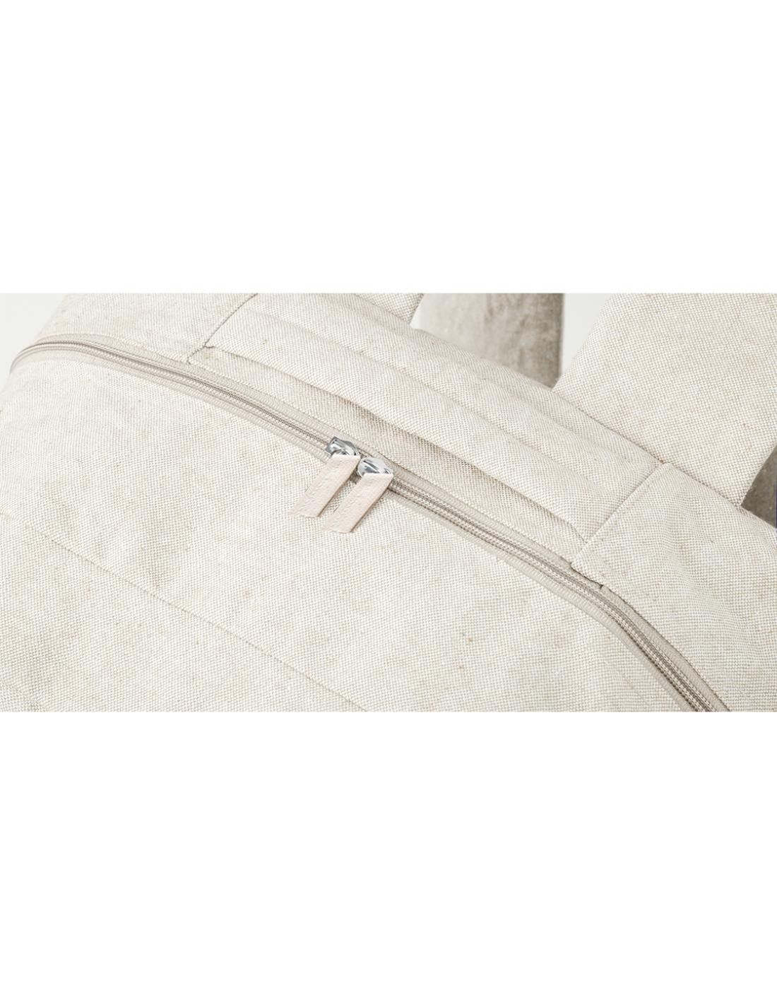 Mochila fabricada en algodón 100% reciclado GRS de 300g/m2. Cuenta con compartimento principal y bolsillo frontal con cierre de cremallera. Incluye asa de transporte y cintas para hombros ajustables a juego, acolchadas para mayor comodidad. Disponible en una variada gama de colores y con logotipo algodón reciclado en la etiqueta exterior. Disponible certificación GRS (Global Recycled Standard / Estándar de Reciclaje Global), que garantiza el origen reciclado del material usado para fabricar el producto.