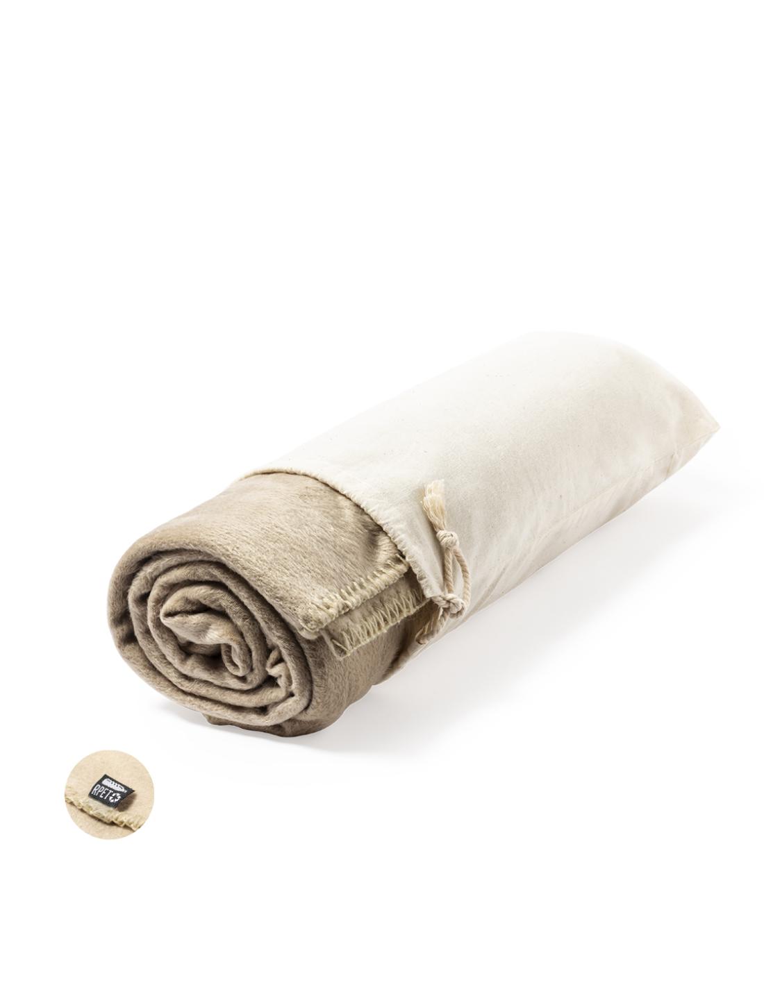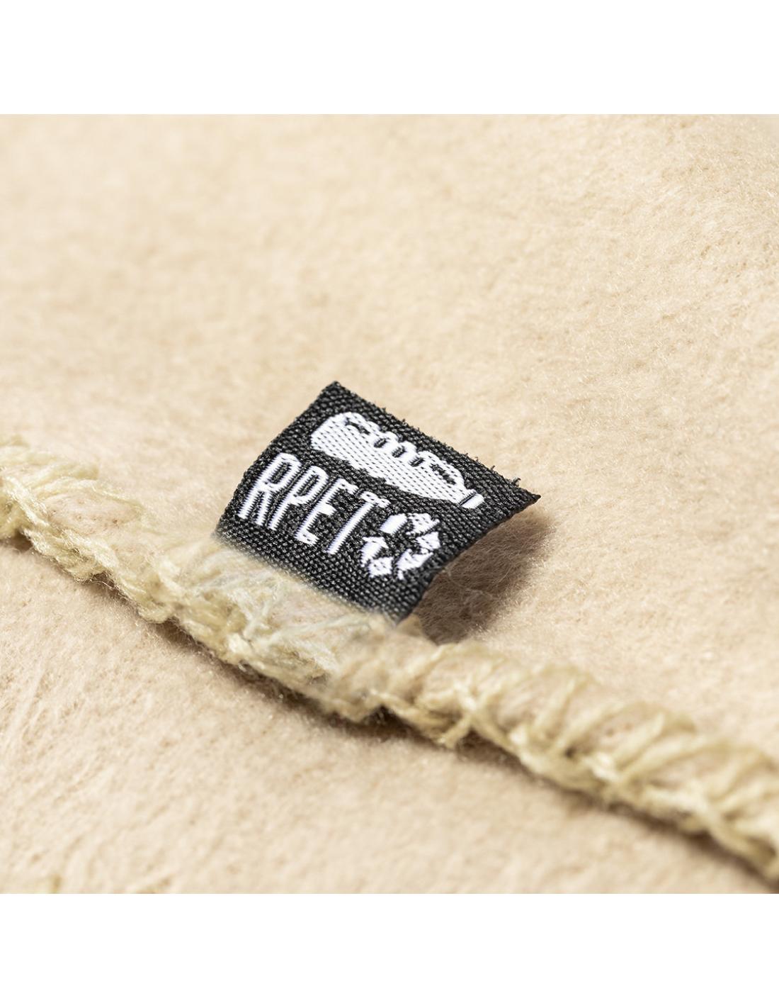 Manta de calidad premium, fabricada en polar fleece RPET de 200/m2, elaborado a partir de plástico reciclado para así fomentar la reutilización de residuos plásticos y contribuir a la sostenibilidad del planeta. Medidas 130x160cm, con acabado natural de suave tacto. Incluye funda de transporte a juego en material 100% algodón. Etiqueta RPET distintiva.