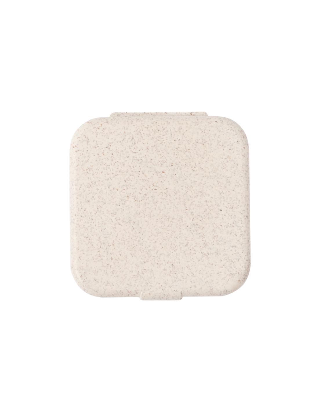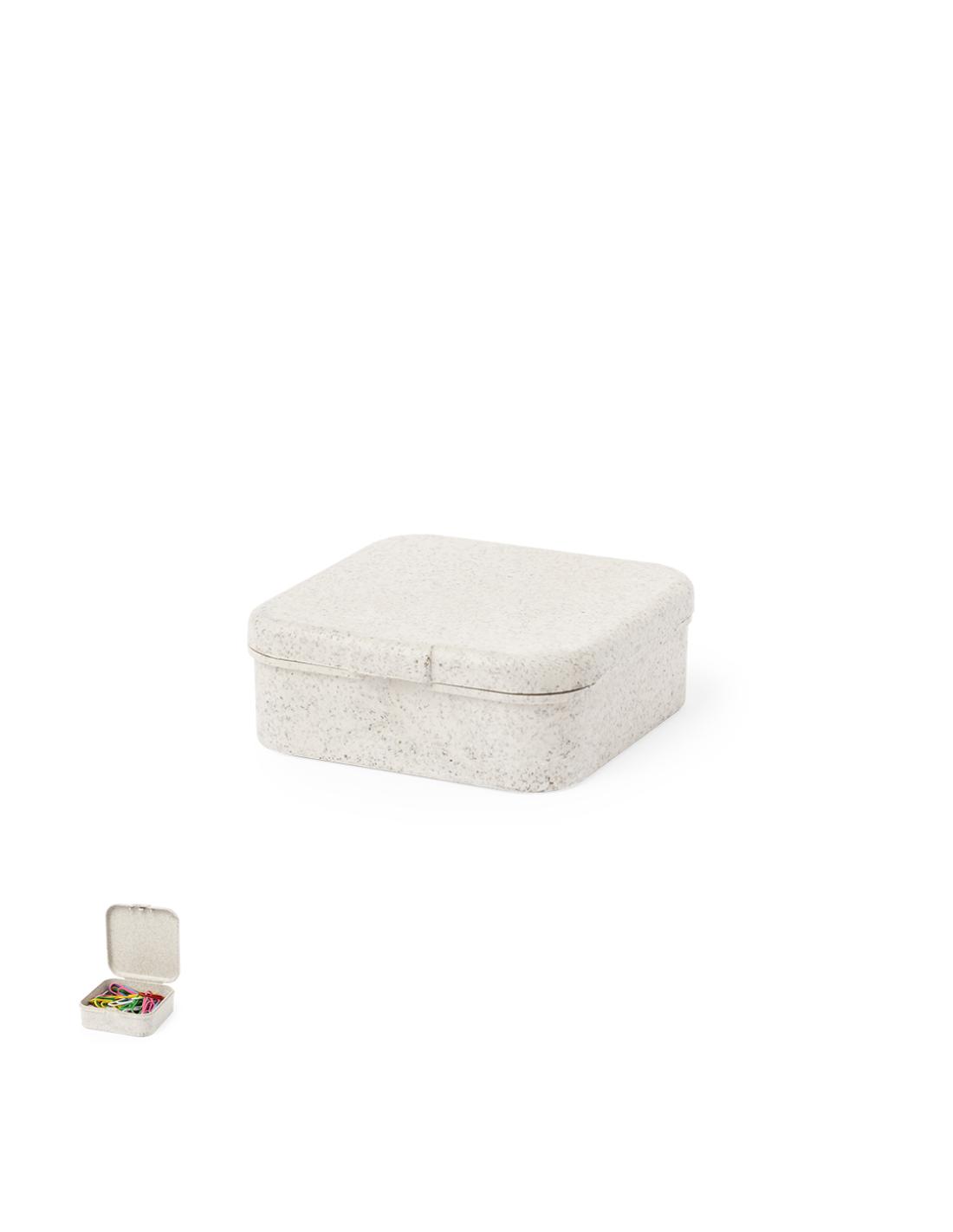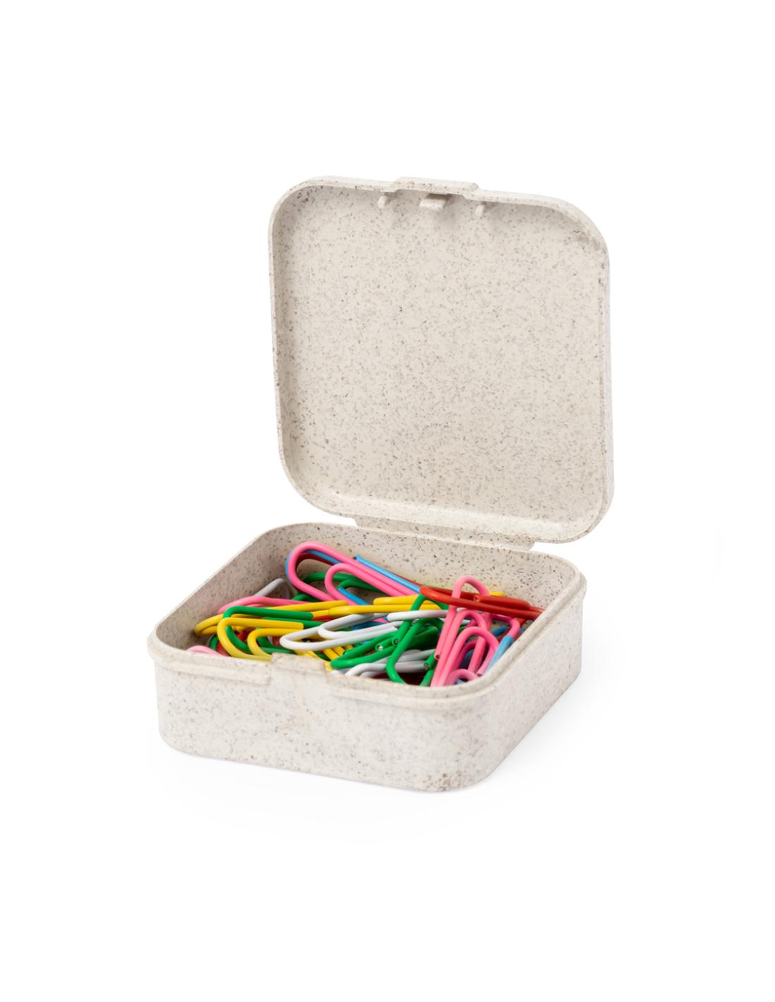 Útil portaclips fabricado en caña de trigo. Con cierre a presión y elaborada a partir de elementos reciclados, con 50 clips en su interior.La caña de trigo fomenta la utilización de materias primas naturales, reduciendo así las emisiones contaminantes.