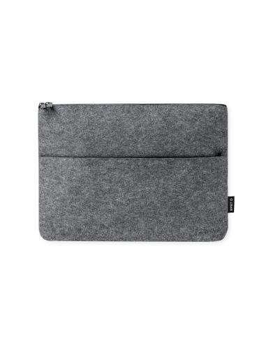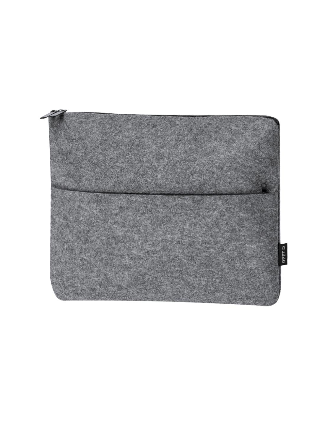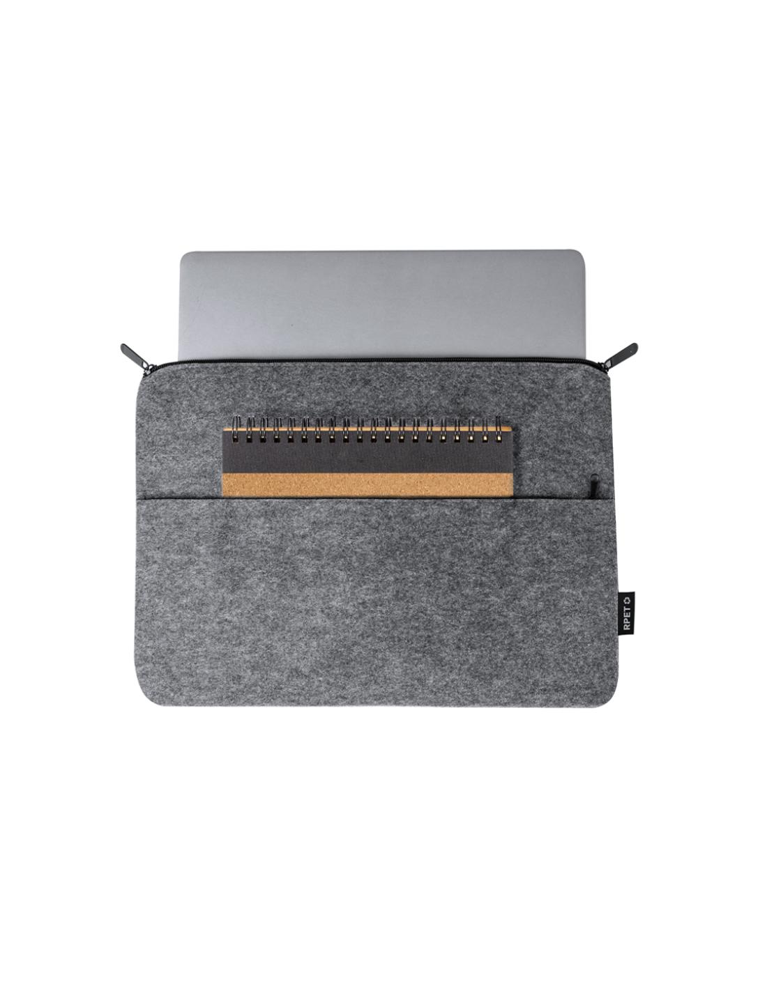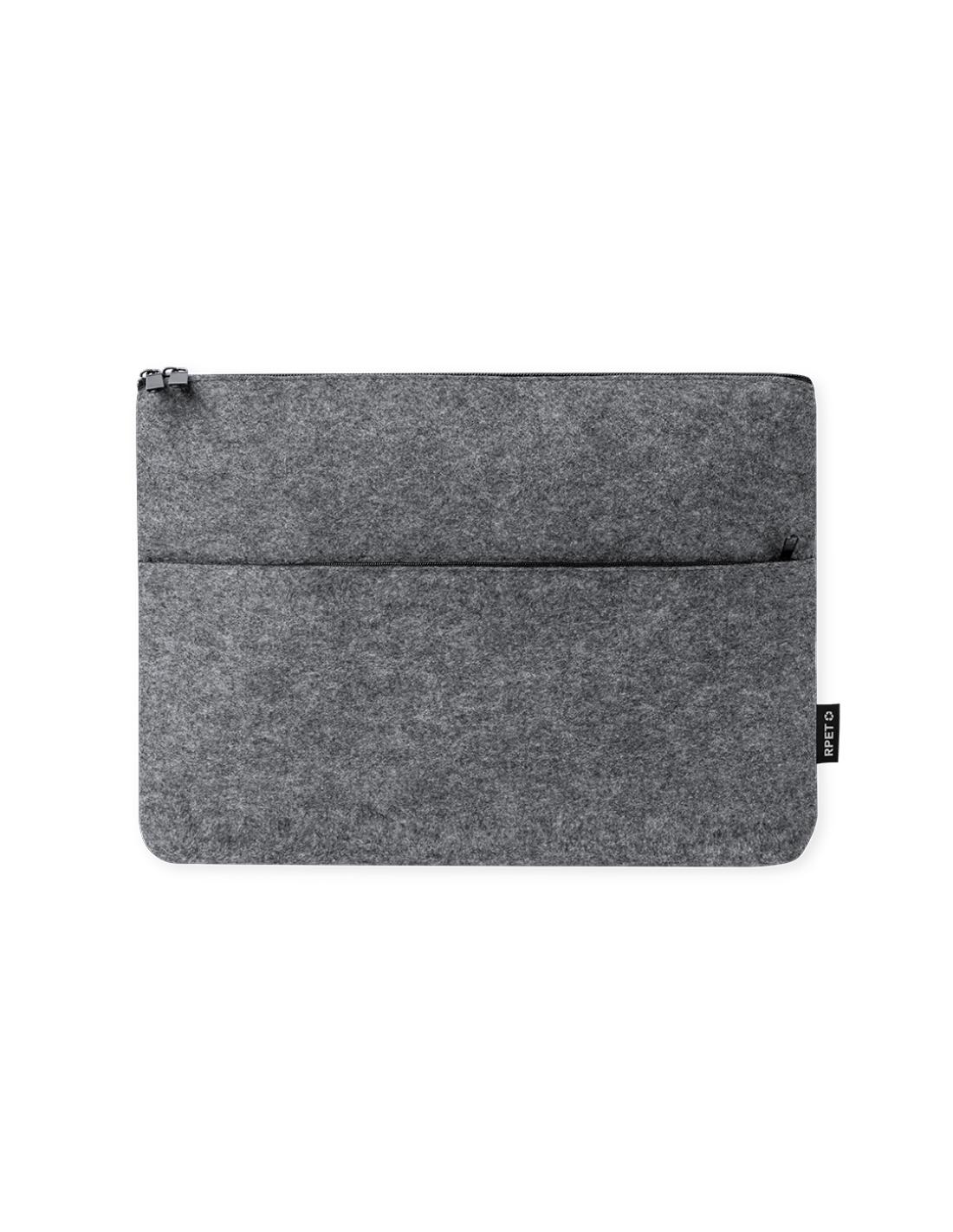 Funda para ordenador portátil fabricada en fieltro RPET. Bolsillo principal acolchado con cierre de cremallera, para portátiles de hasta 15 pulgadas, y bolsillo frontal para objetos más pequeños. Logotipo RPET en etiqueta. El fieltro RPET es fruto de la combinación del proceso de reciclaje de materiales plásticos junto con la técnica milenaria de fabricación del fieltro, dando como resultado un material de eco-tendencia que, además de ser de origen reciclado, también se convierte en reciclable.