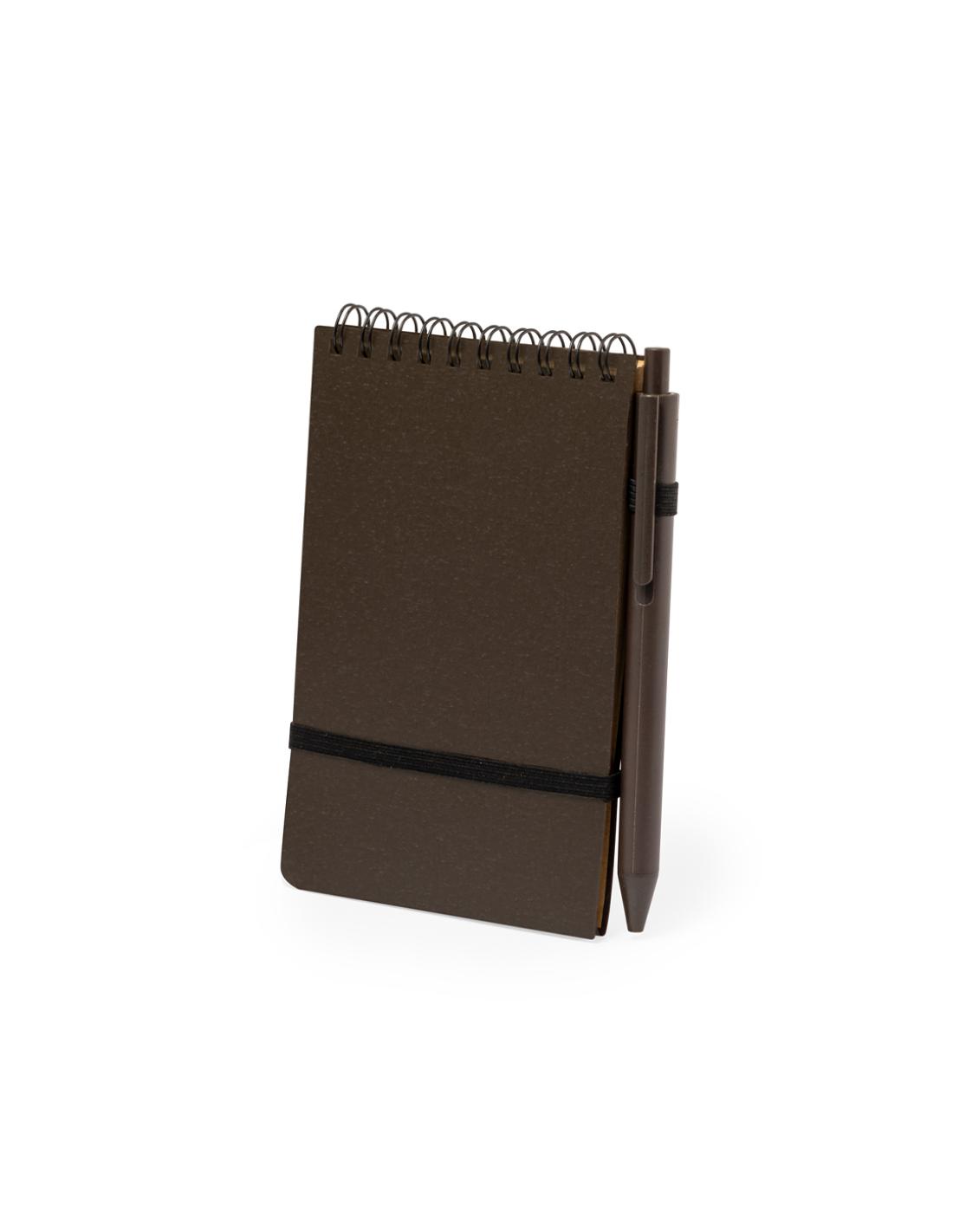Set de libreta y bolígrafo fabricado en fibra de café. Libreta de anillas dobles con tapas blandas, cierre elástico y soporte para el bolígrafo. De 70 hojas y disposición a una raya. Bolígrafo de mecanismo pulsador y tinta azul. Incluye logotipo fibra de café impreso en libreta y bolígrafo. Presentado en bolsa individual reciclada.La fibra de café se elabora a partir de los residuos producidos en la obtención del café. Una alternativa sostenible que favorece la reducción del uso de plásticos, ahorrando energía en el proceso de fabricación y fomentando así el cuidado del medio ambiente.