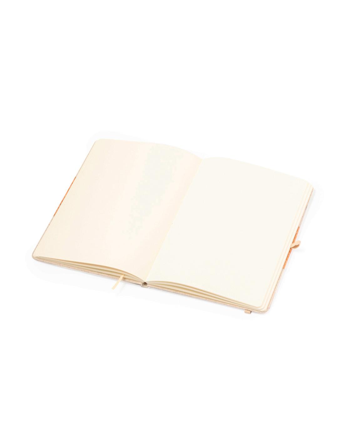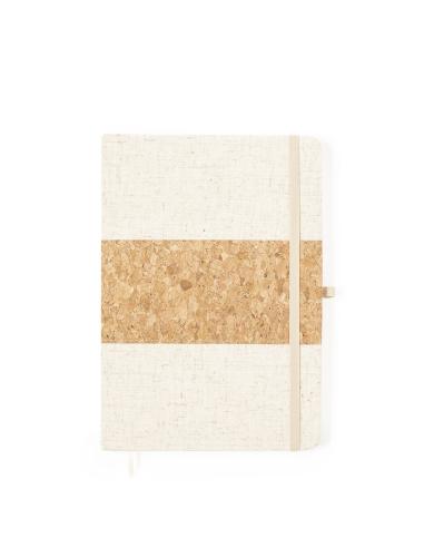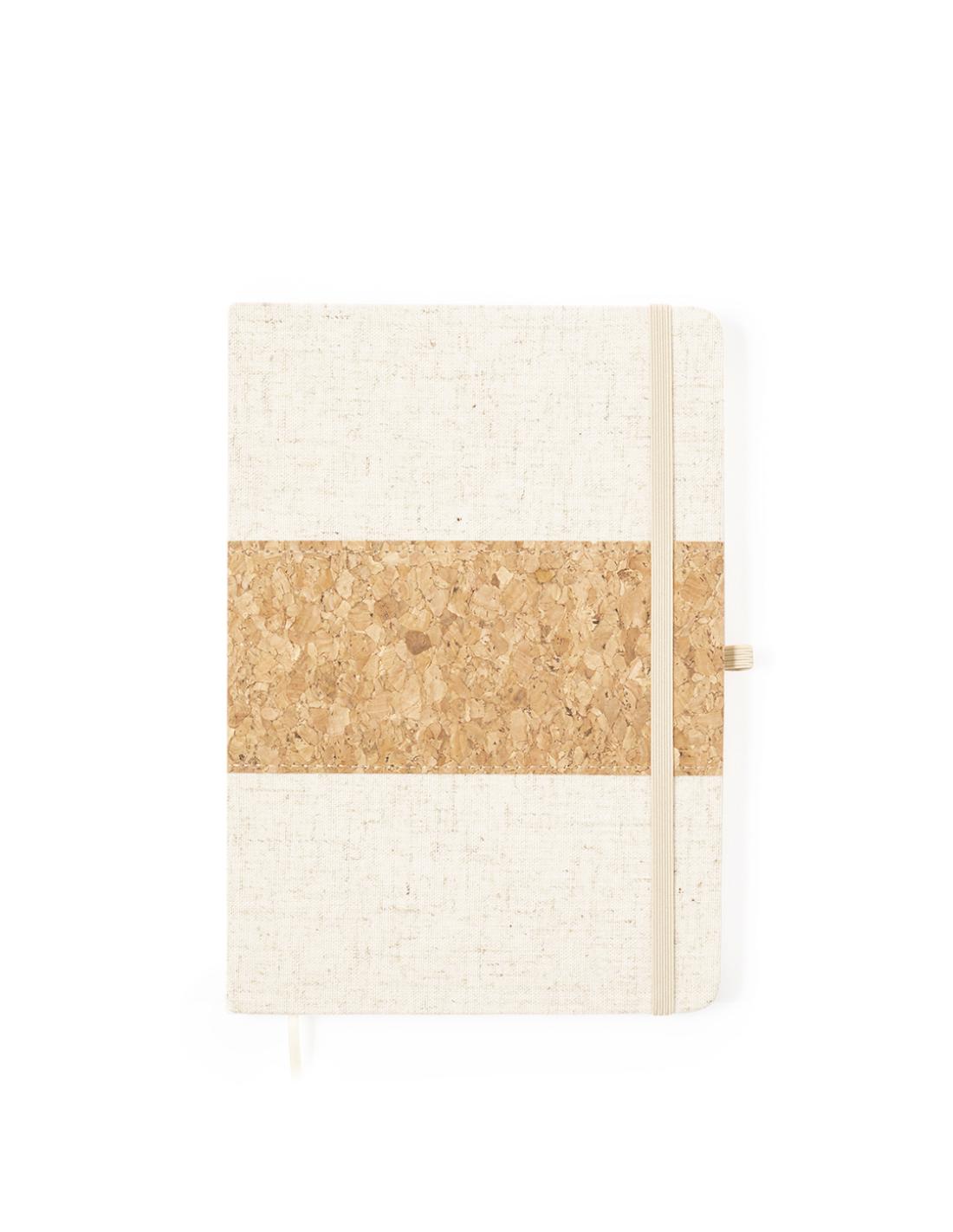 Bloc de notas de tapas exteriores confeccionadas en corcho y lino. De tapas rígidas, con soporte para bolígrafo, marcapáginas y 80 hojas lisas color natural. Presentado en bolsa individual. Elaborado con elementos vegetales para así fomentar la utilización de materias primas naturales y reducir las emisiones contaminantes.