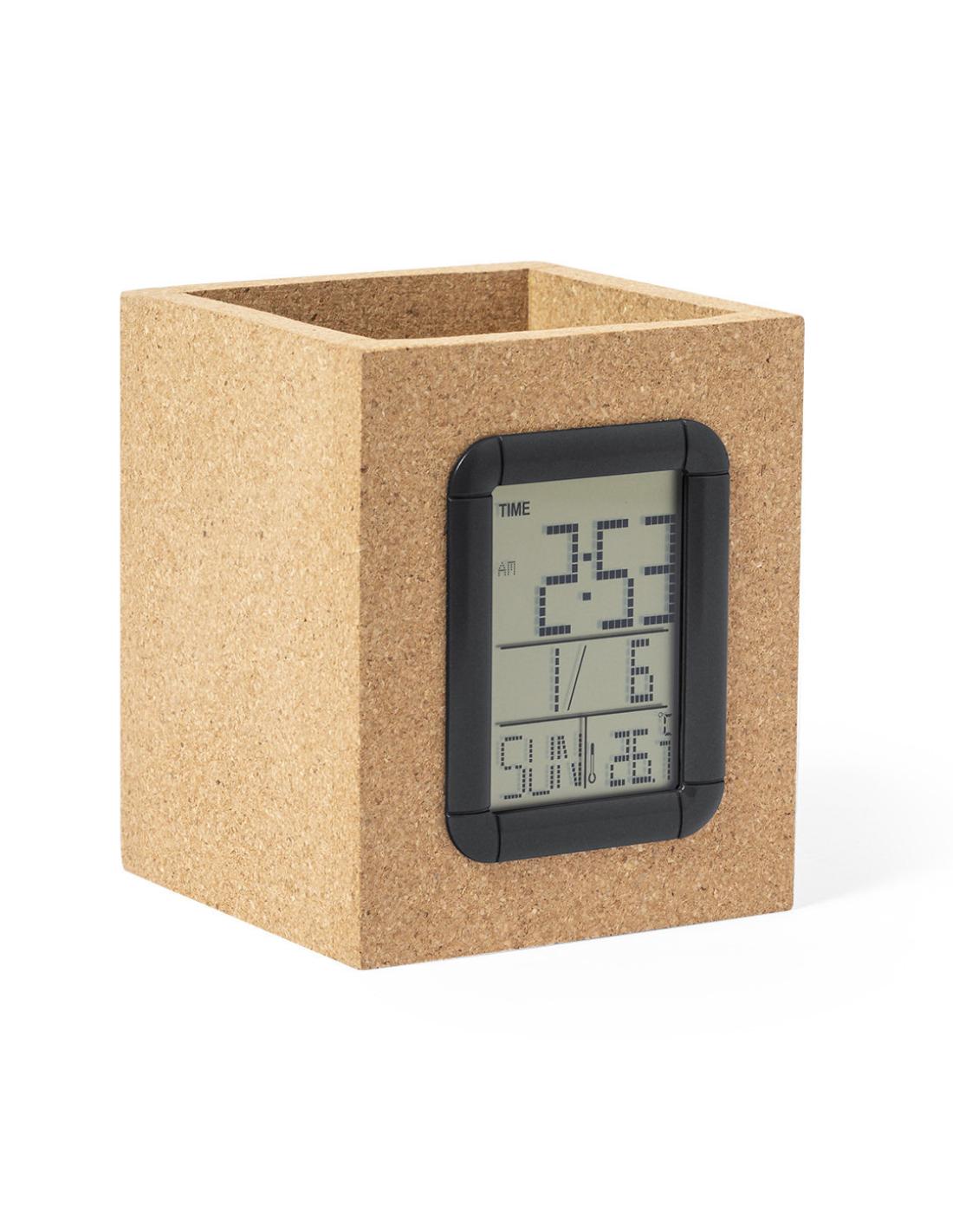 Lapicero de línea nature con reloj multifunción integrado. Fabricado en corcho natural, con funciones termómetro, calendario y alarma. Alimentación a pilas (de botón incluidas) y presentado en atractiva caja de diseño eco.