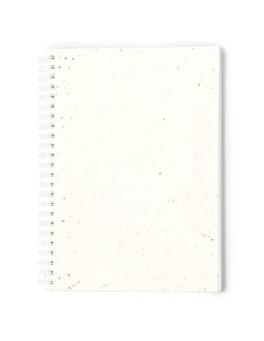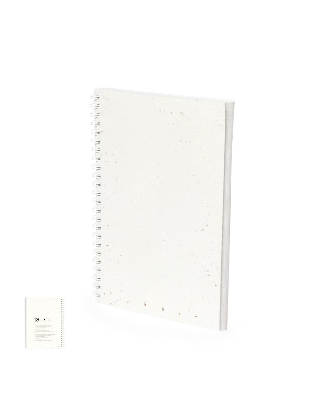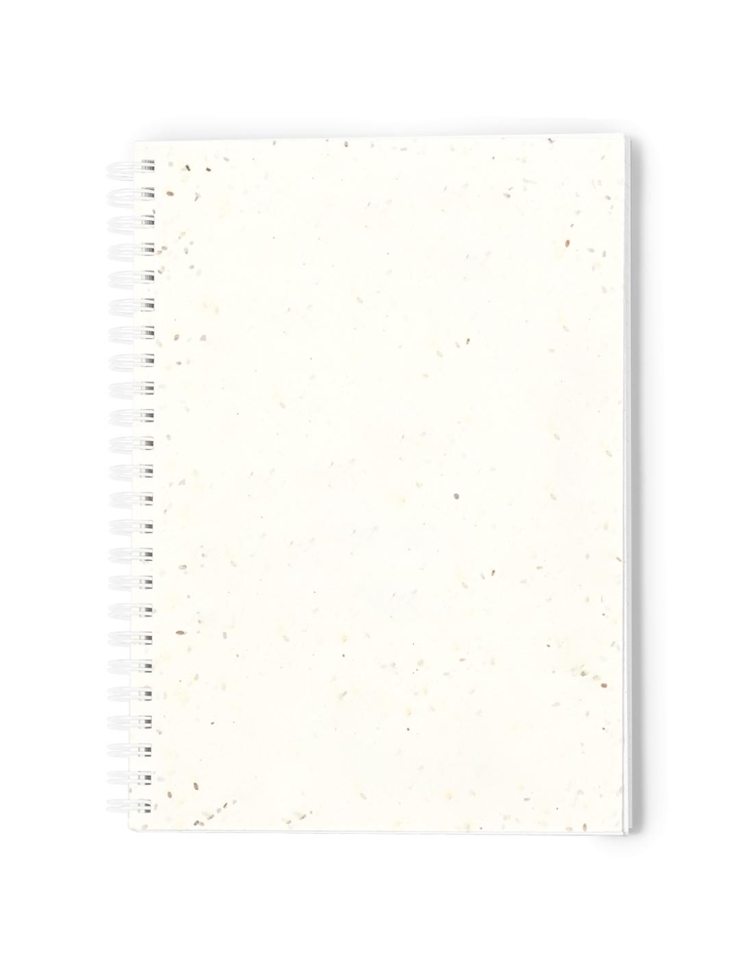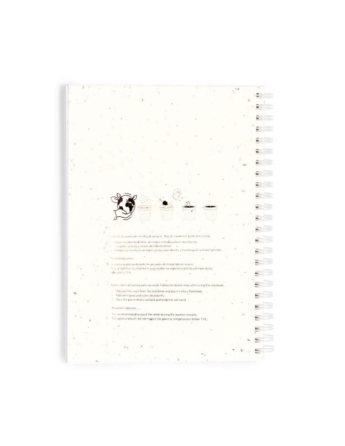 Libreta de anillas con tapas blandas fabricadas en papel de semilla. Con 80 hojas blancas lisas. Las cubiertas incluyen semillas de petunia, convirtiéndolo en papel plantable al final de su vida útil. Incluye instrucciones de plantado en la cubierta trasera y se presenta en una bolsa individual de papel reciclado.