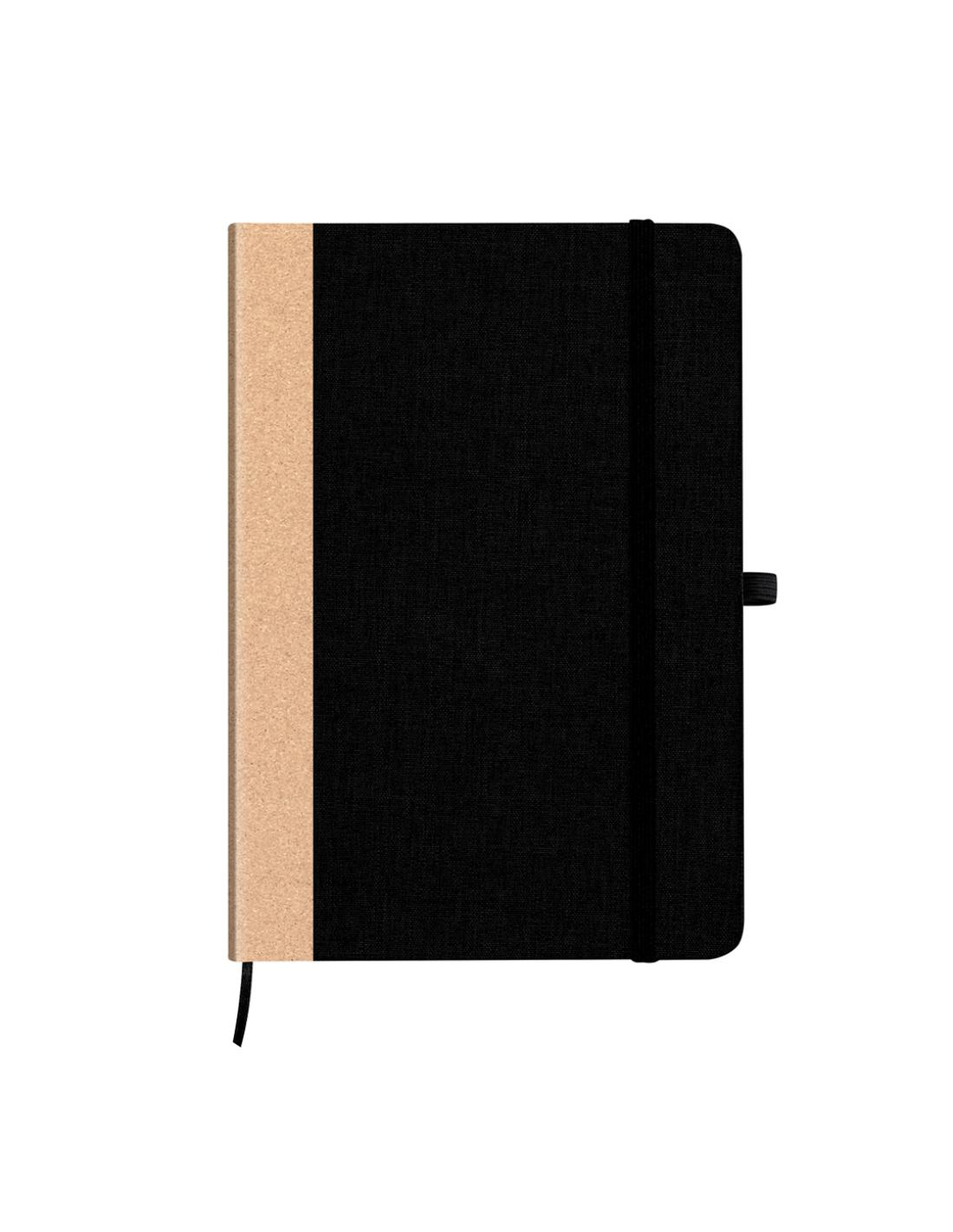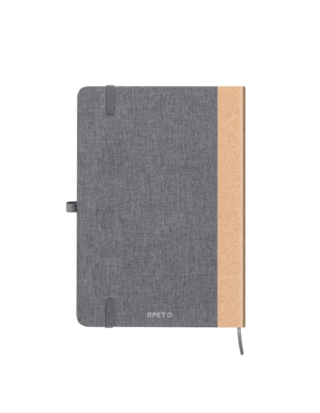 Bloc de notas con tapas rígidas fabricadas en RPET, con el lomo en corcho. Incluye interior con 80 hojas lisas, marcapáginas, elástico de cierre y soporte para bolígrafo a juego. logotipo RPET en contraportada y disponible en elegantes colores. Presentado en una bolsa individual de papel reciclado.El material RPET se elabora a partir de plástico reciclado, para así fomentar la reutilización de residuos plásticos y ayudar a la sostenibilidad del planeta.