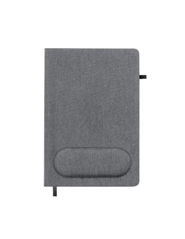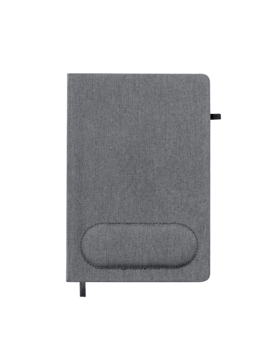 Libreta alfombrilla elaborada en RPET 300D con tapas rígidas. Destaca por su original soporte en la portada con forma ergonómica para la muñeca y así poder usarse como alfombrilla de ratón. Incluye marcapáginas y un soporte para bolígrafo a juego. Contiene 100 hojas interiores lisas y está disponible en un elegante color gris. Con logotipo RPET en contraportada y presentada en bolsa individual reciclada.El material RPET se elabora a partir de plástico reciclado, para así fomentar la reutilización de residuos plásticos y ayudar a la sostenibilidad del planeta.