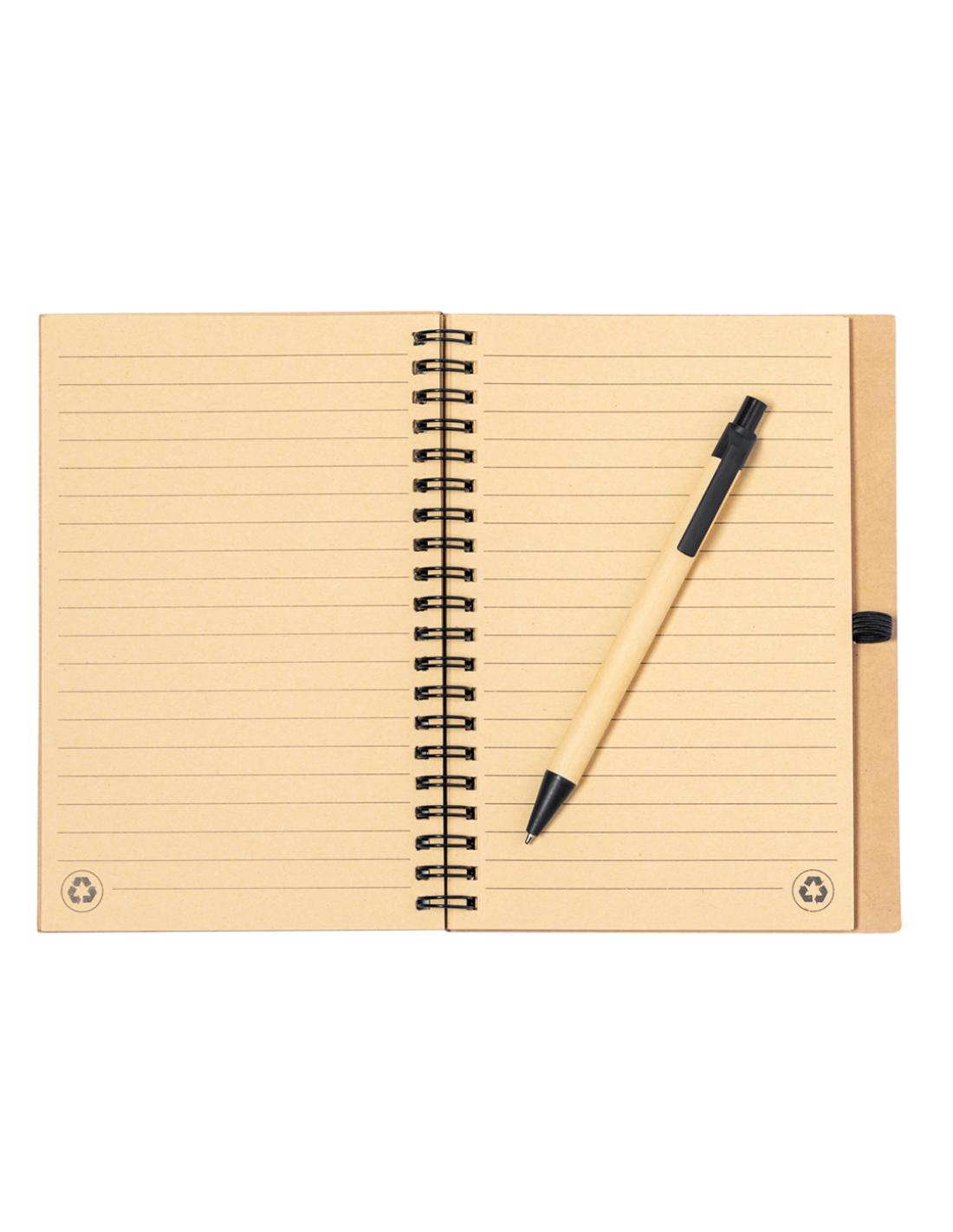 Set de libreta y bolígrafo confeccionado en corcho y cartón reciclado. La libreta de anillas destaca por sus tapas rígidas en corcho natural, con 80 hojas de disposición a una raya. Incluye bolígrafo de mecanismo pulsador con cuerpo fabricado en cartón reciclado y en tinta azul. Presentado en bolsa de papel reciclado. Elaborado con elementos vegetales para así fomentar la utilización de materias primas naturales y reducir las emisiones contaminantes.