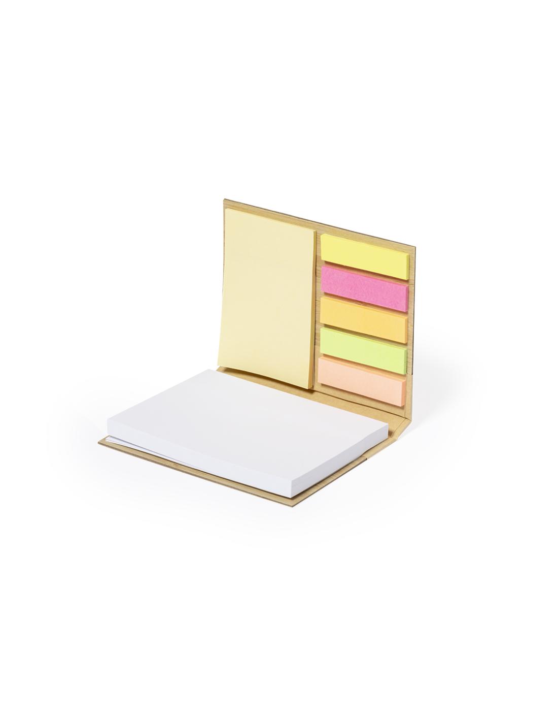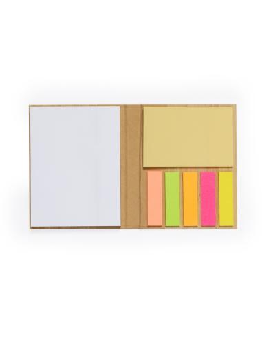 Bloc de notas de 70 hojas con tapas rígidas de bambú. Interior con 25 notas adhesivas 7,5x5cm y 125 mininotas adhesivas de 4,5x1,2cm en 5 colores diferentes. Presentado en bolsa de papel individual.Materiales como el bambú fomentan la utilización de materias primas naturales, reduciendo las emisiones contaminantes. Proviene de una planta de gran resistencia y versatilidad, con crecimiento y regeneración rápidos, siendo una excelente alternativa al uso de madera tradicional.