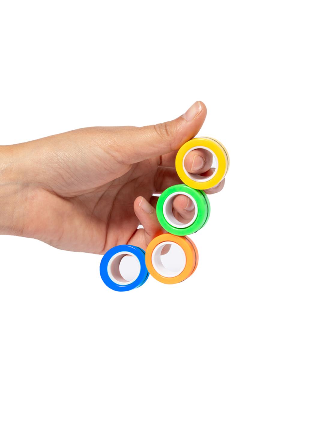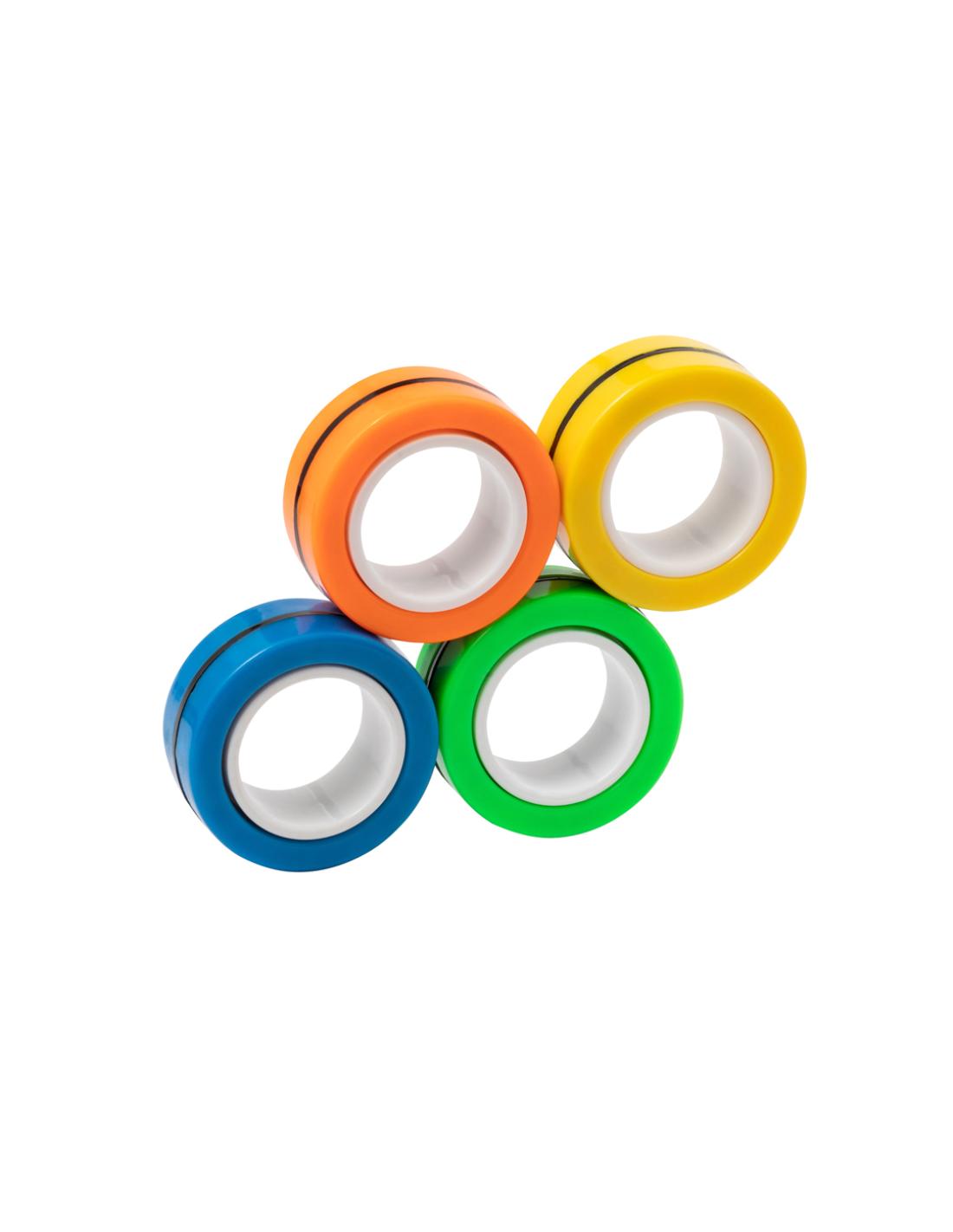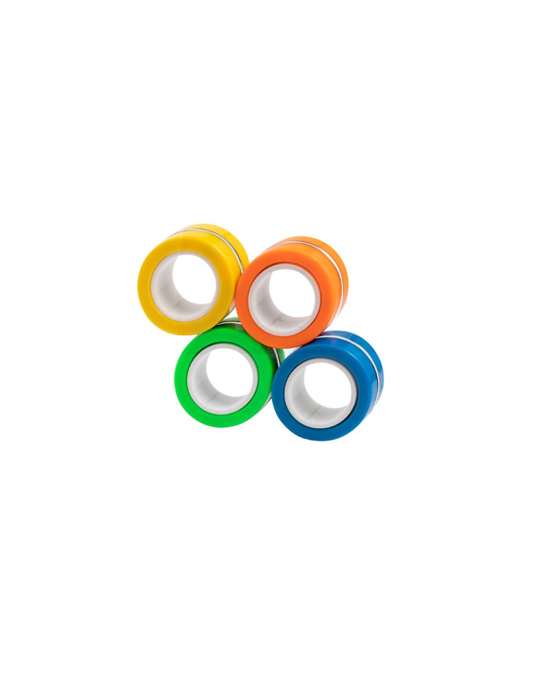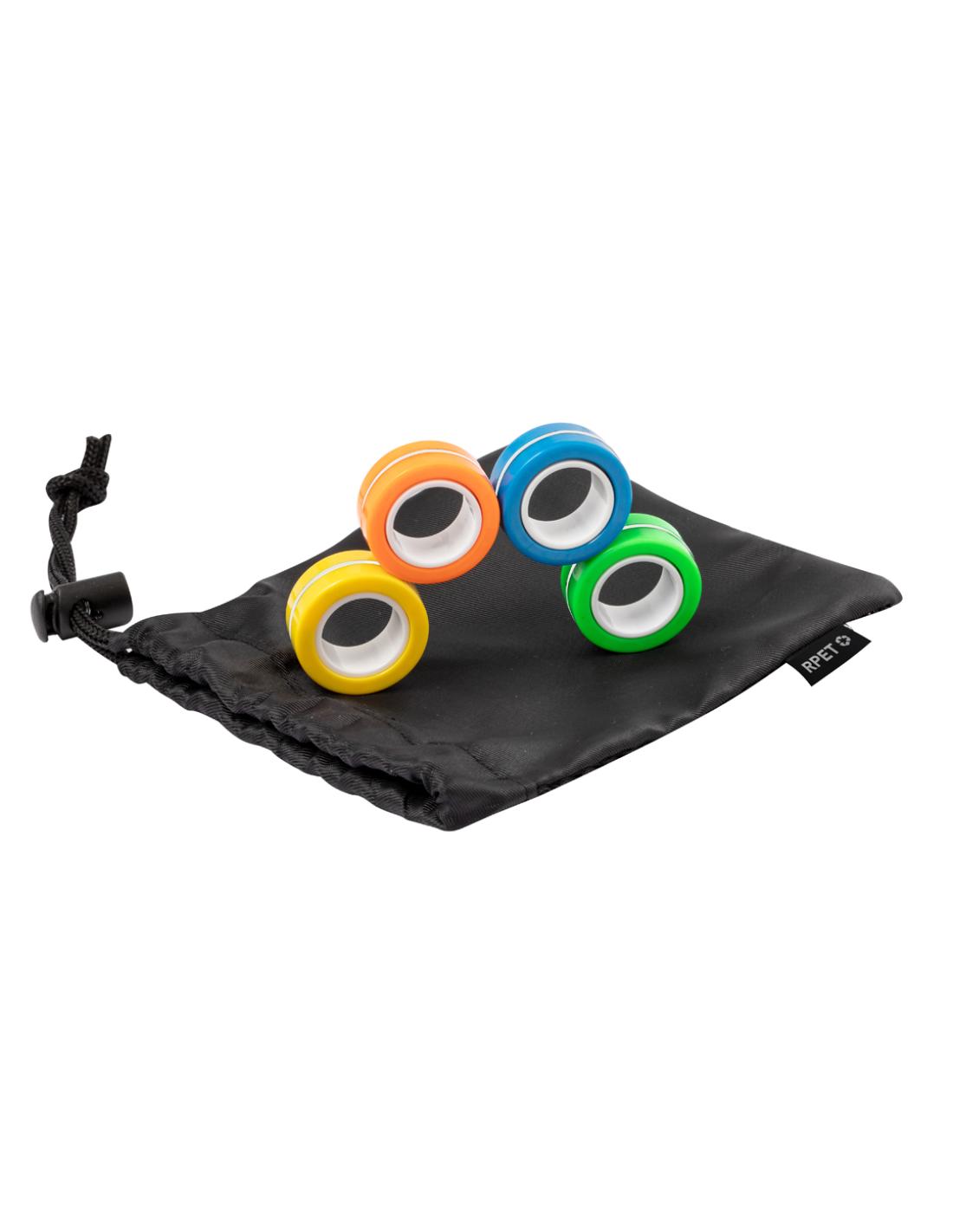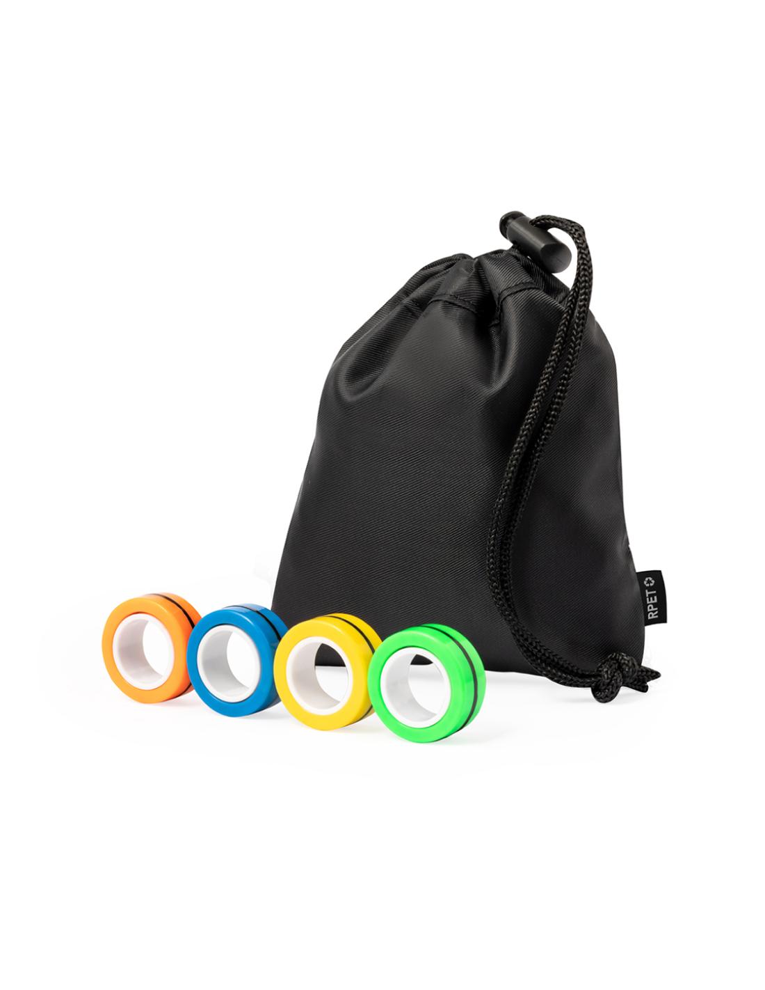 Original antiestrés en forma de anillos. Cuenta con cuatro piezas de colores con imanes para poder juntar y separar tantas veces como se quiera, liberando tensión gracias a su característico movimiento circular. Además, ofrecen la posibilidad de usarlos como spinner, ya sea juntos o por separado. Presentado individualmente en bolsa reciclada de RPET.