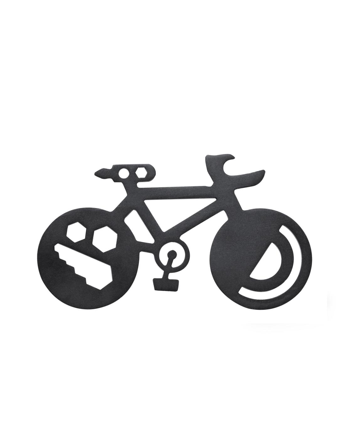 Original y práctica multiherramienta en acero inox con forma de bicicleta. Con 16 funciones, entre otras: destornillador de punta plana y philips, llave para tuercas hexagonales en varios tamaños, regla, transportador de ángulos y abrebotellas. Presentada en bolsa de papel reciclada.