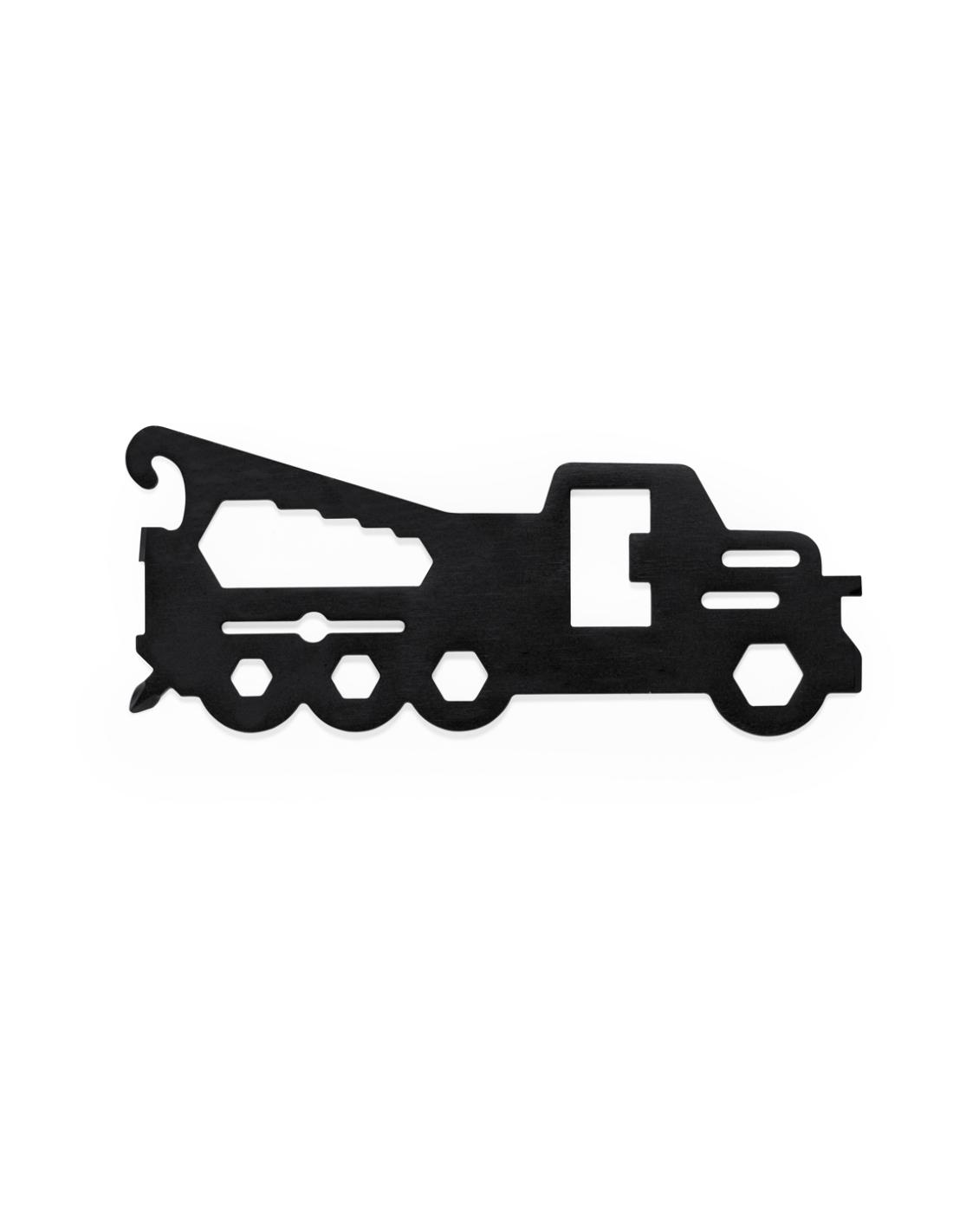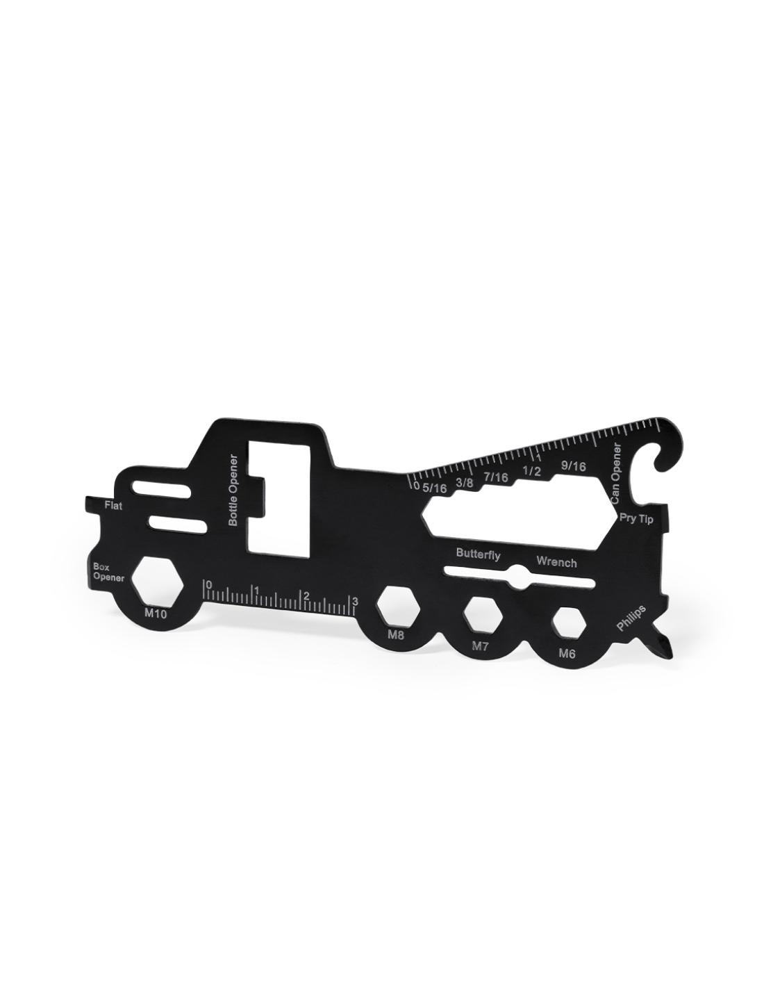 Original y práctica multiherramienta en acero inox con forma de camión. Con 18 funciones, entre otras: destornillador de punta plana y philips, llave para tuercas hexagonales en varios tamaños, regla, abridor de cajas y abrebotellas. Presentado en bolsa de papel reciclada.